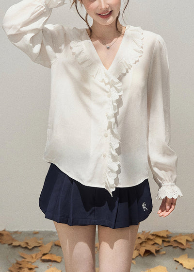 Simple White Ruffled Patchwork Cotton Shirts Fall