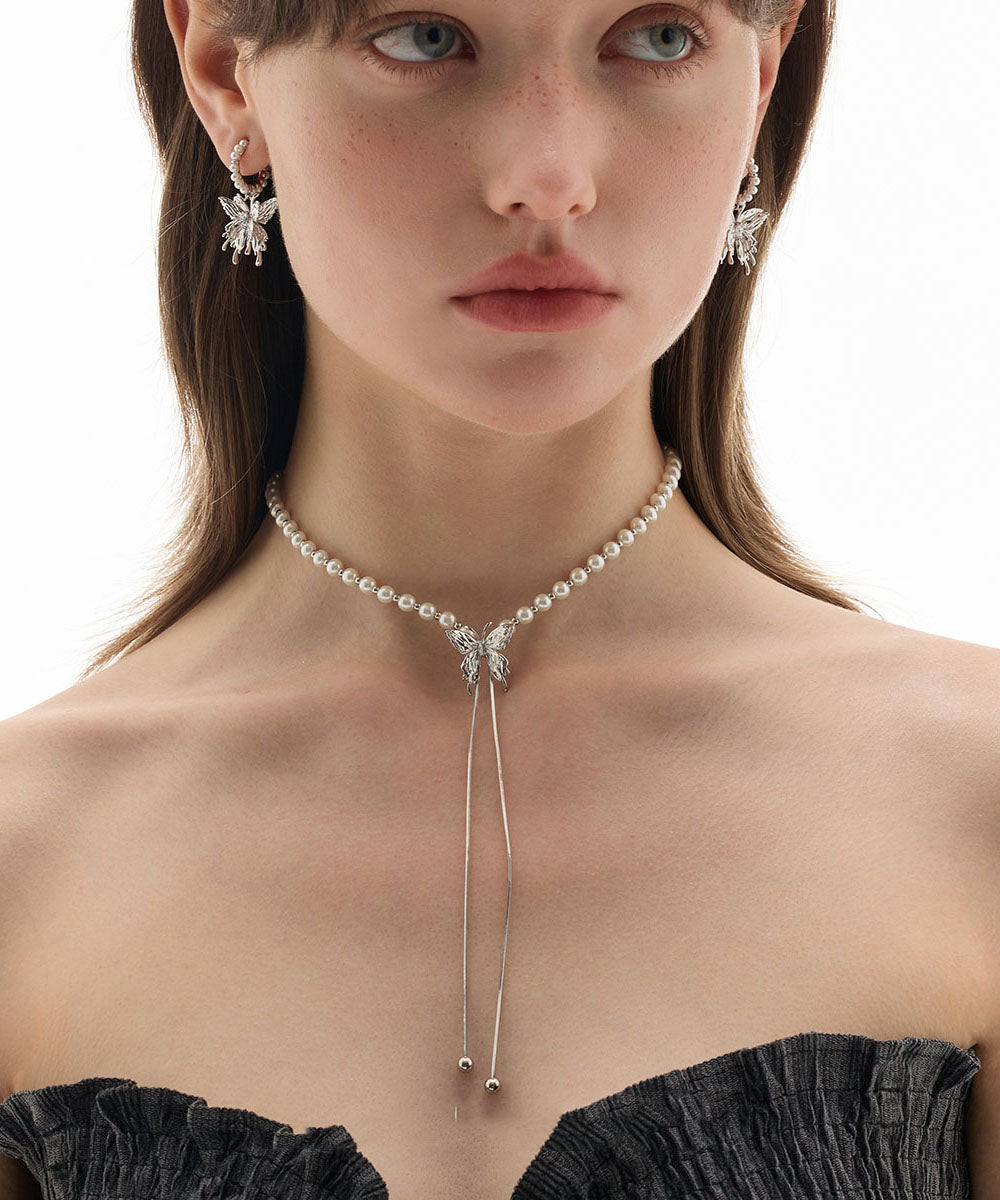 Modern White Copper Overgild Pearl Butterfly Retractable Lariat Necklace