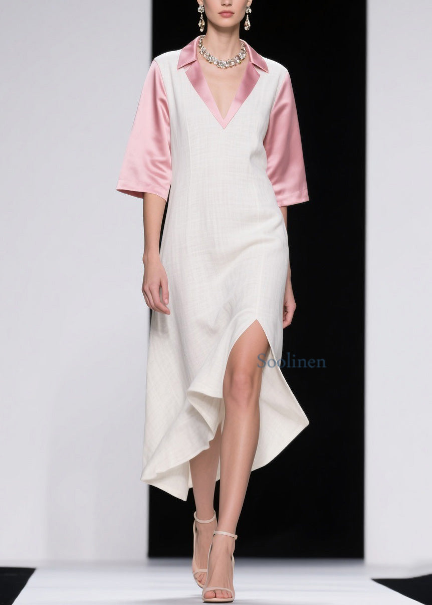 Elegant Colorblock Asymmetrical Patchwork Linen Silk Dresses Summer
