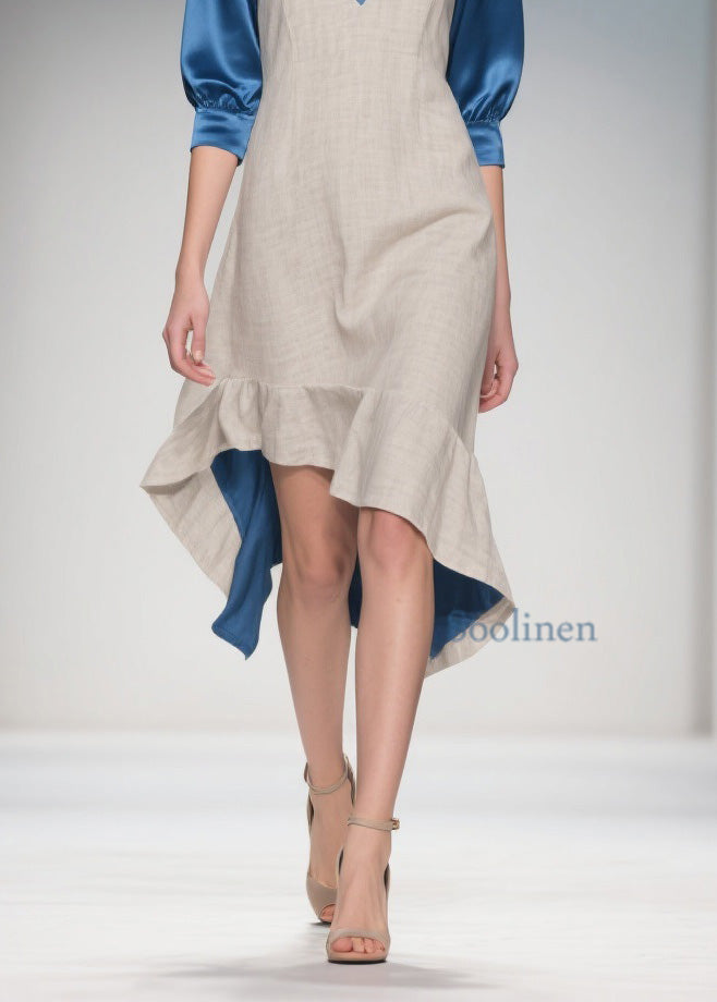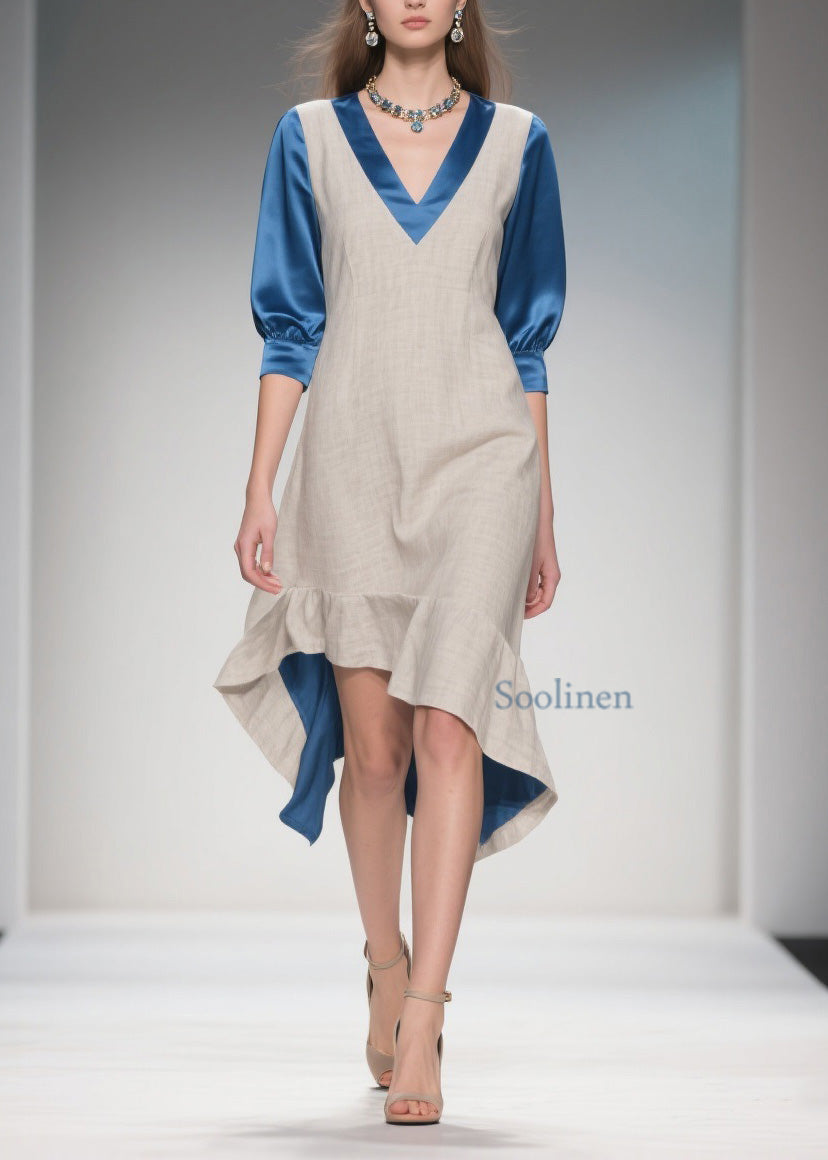 Women Colorblock Ruffled Patchwork Linen Silk Dress Summer
