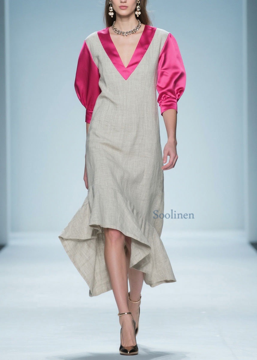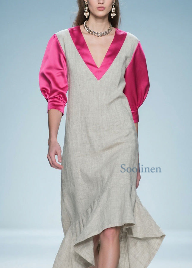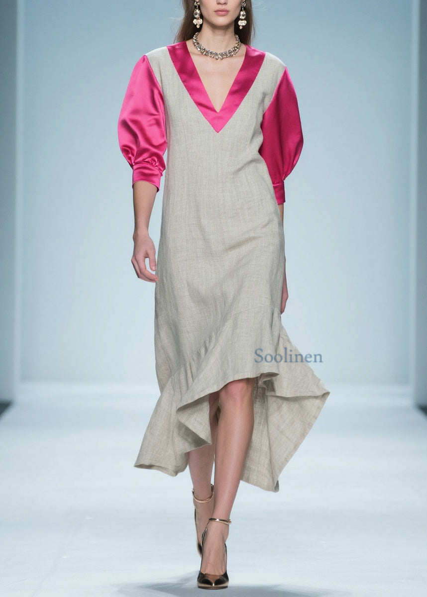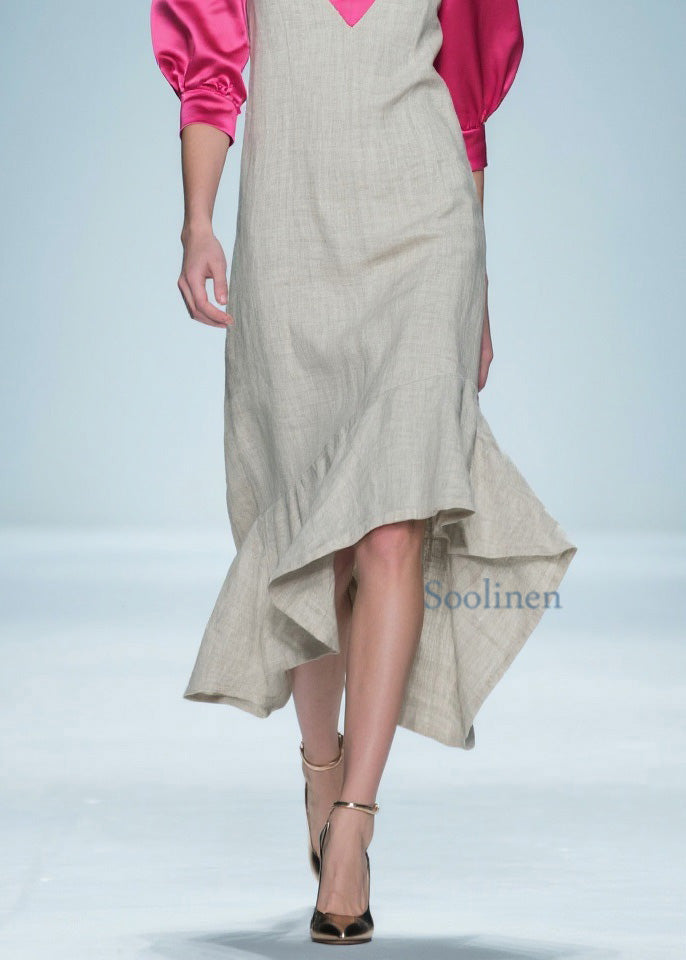 Women Colorblock Ruffled Patchwork Linen Silk Long Dress Summer