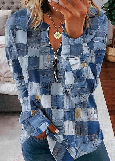 Casual Blue Zip Up Print Patchwork Cotton Blouses Long Sleeve