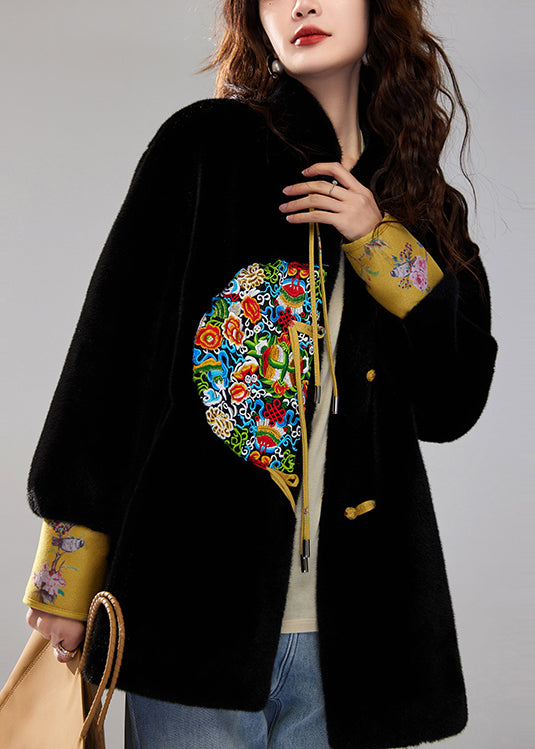 Vintage Black Embroidered Tasseled Faux Mink Velvet Coats Winter
