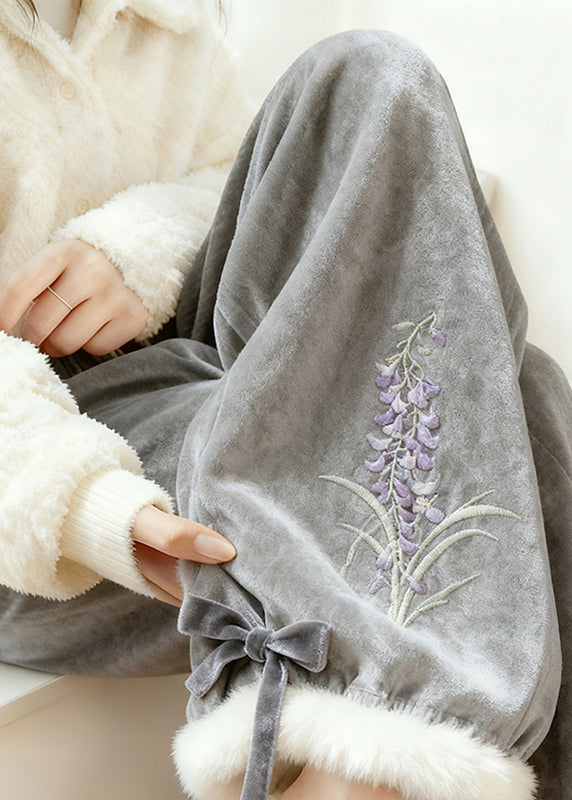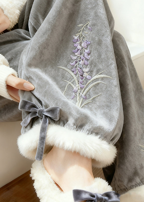 Vintage Grey Embroidered Warm Fleece Silk Velvet Pants Winter