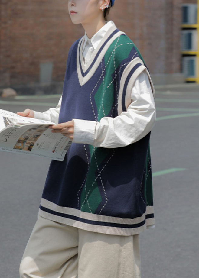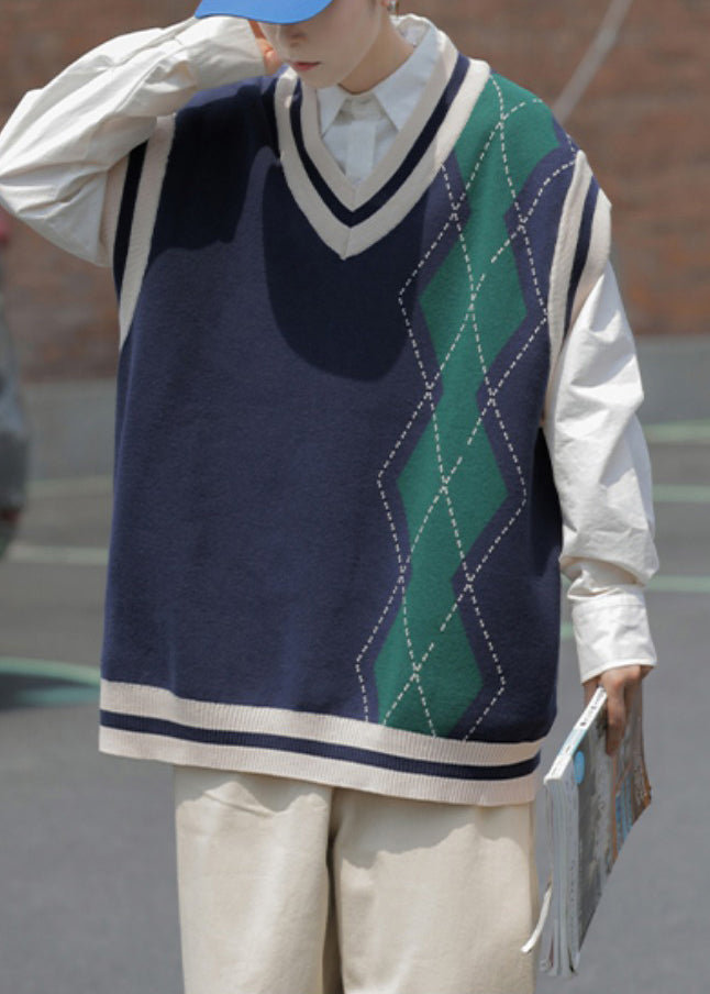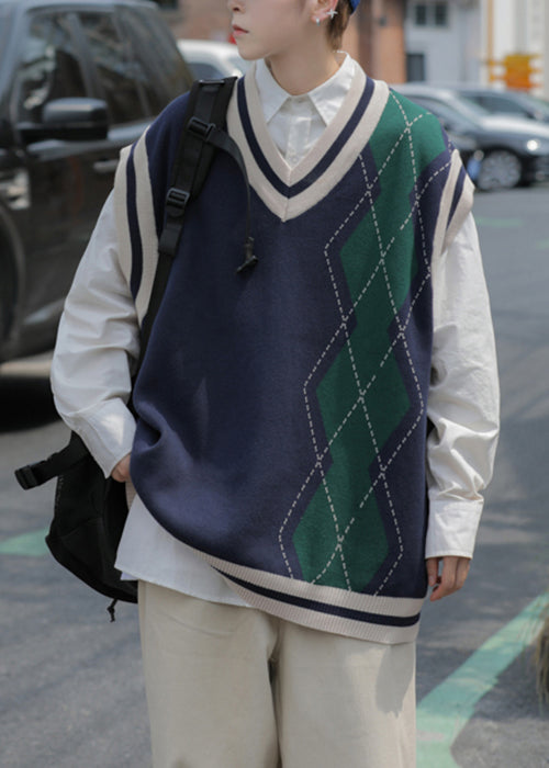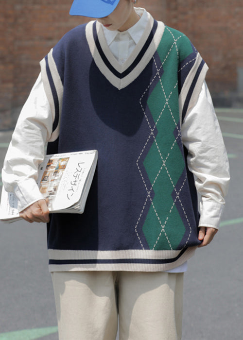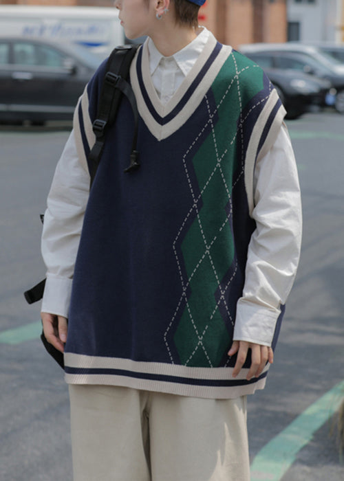 Original Navy V Neck Plaid Patchwork Knit Men Vest Sleeveless