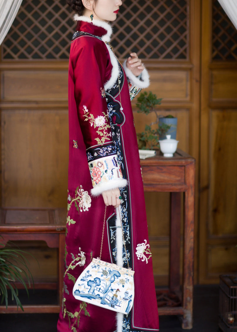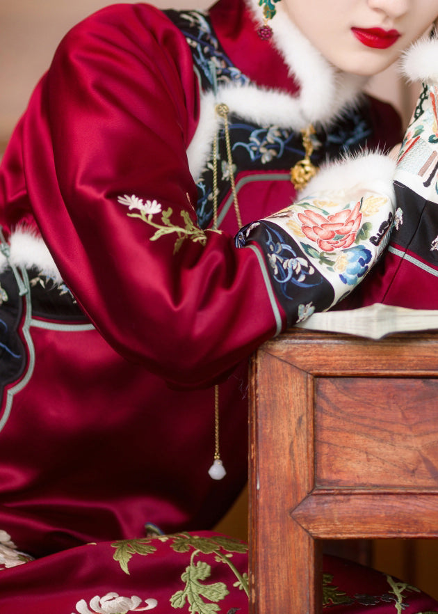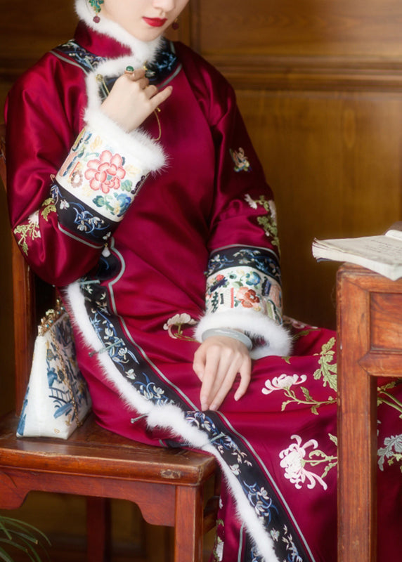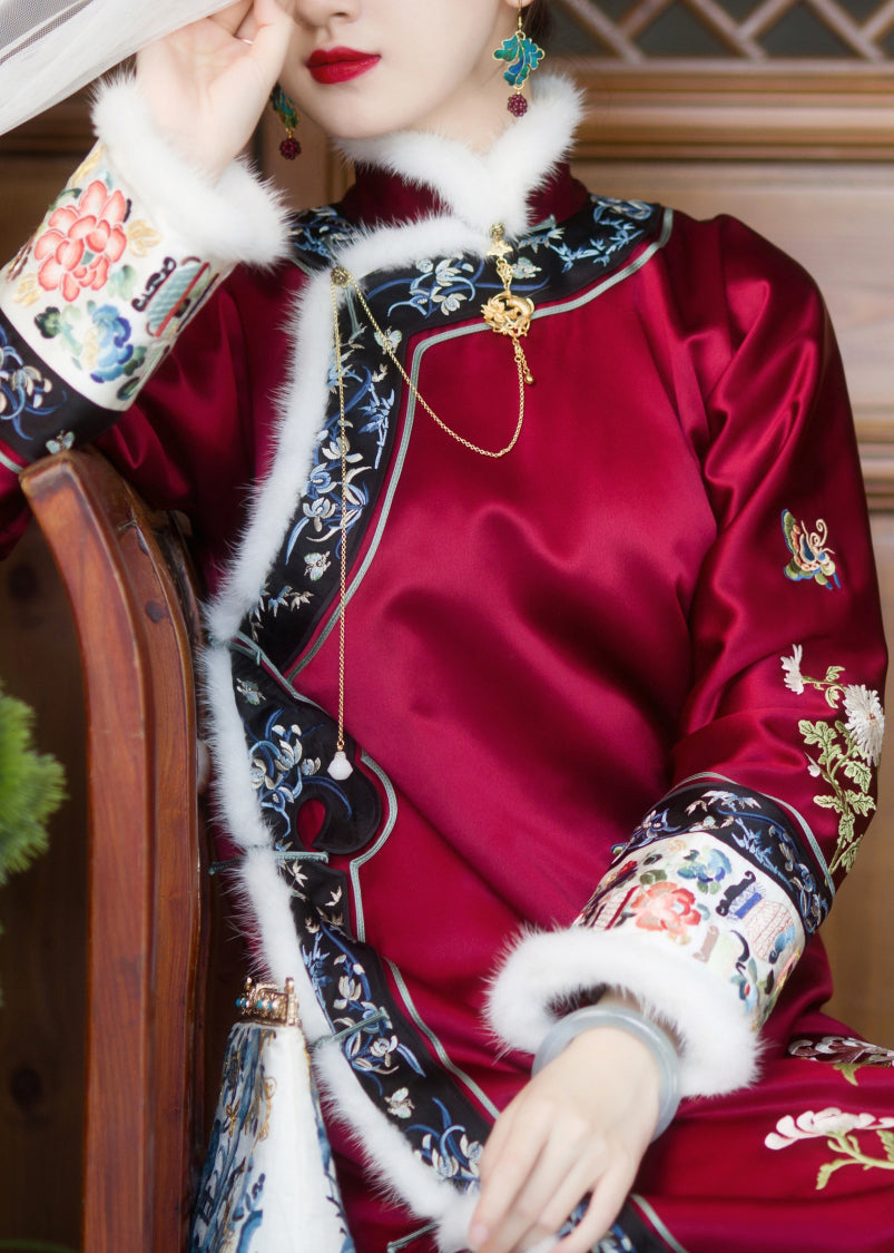 Vintage Red Faux Fur Collar Embroideried Button Side Open Thick Silk Cheongsam Long Sleeve