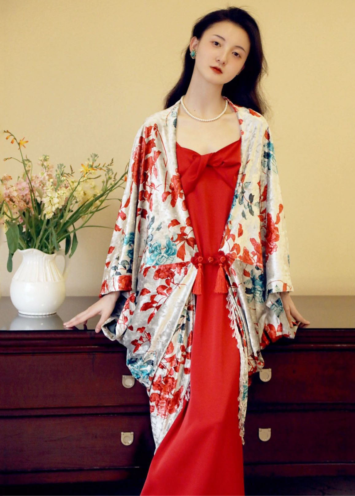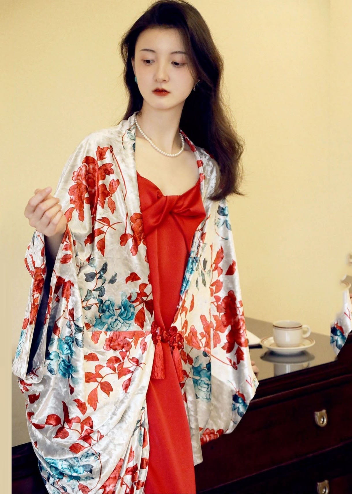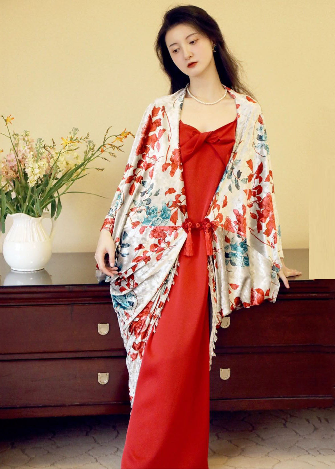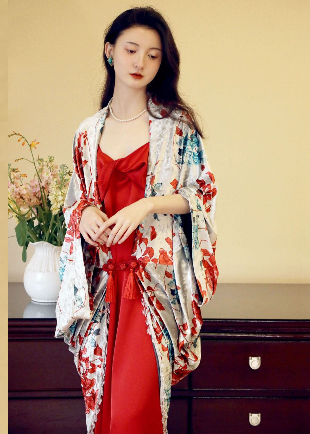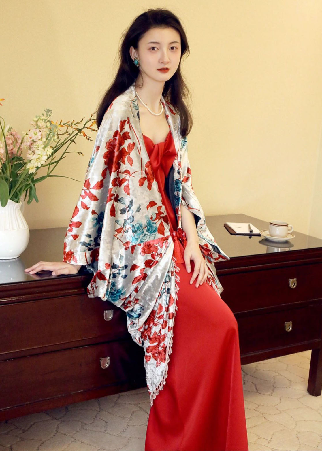 Vintage Red Print Cardigans And Slip Dress Two Pieces Set Fall