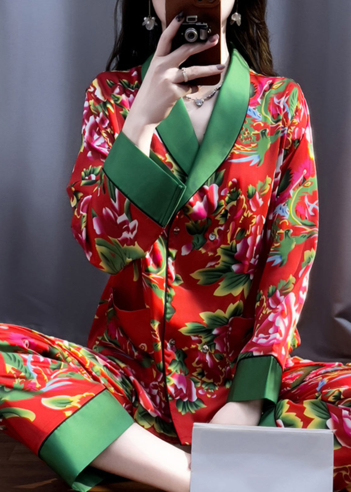 Vintage Red V Neck Print Top And Pants Silk Two Pieces Set Long Sleeve