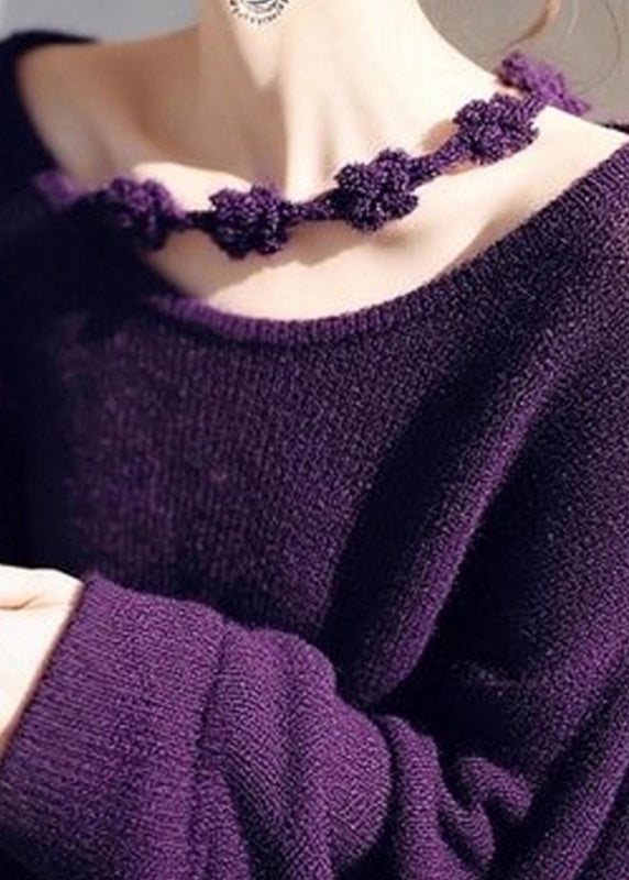 Women Wine Red O-Neck Floral Cozy Knit Sweater Fall