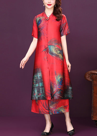 Original Design Red Stand Collar Print Silk Shirt Top And Pants Two Pieces Set Summer