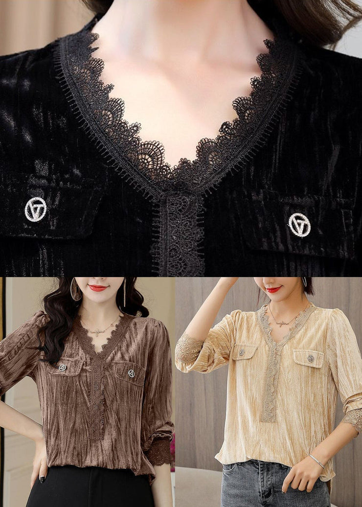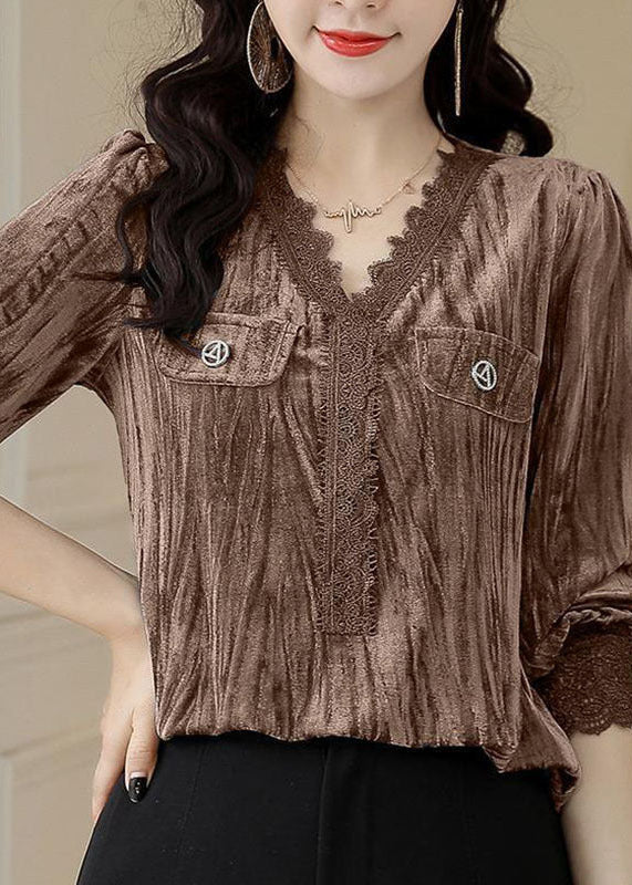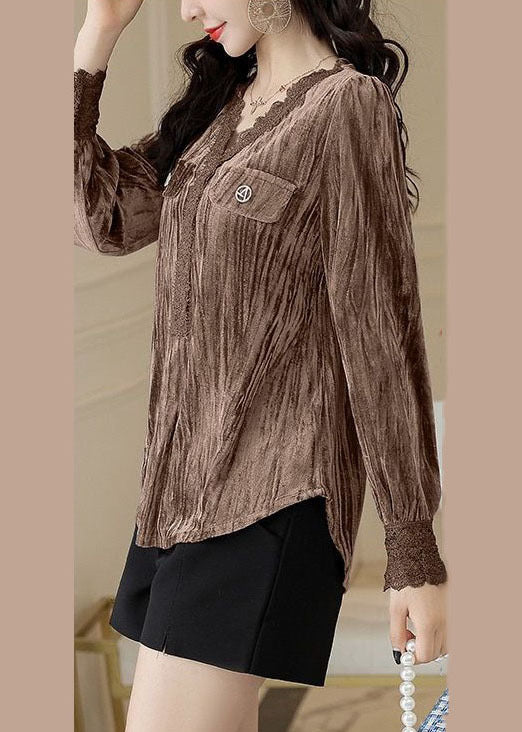 Stylish Caramel V Neck Patchwork Silk Velour Blouses Long Sleeve