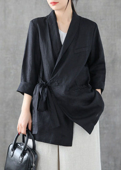 Casual Black Asymmetrical Design Pockets Linen Coats Long Sleeve