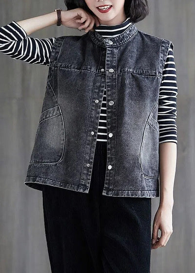 Loose Black Grey Colour O-Neck Patchwork Button Pockets Denim Waistcoat Sleeveless