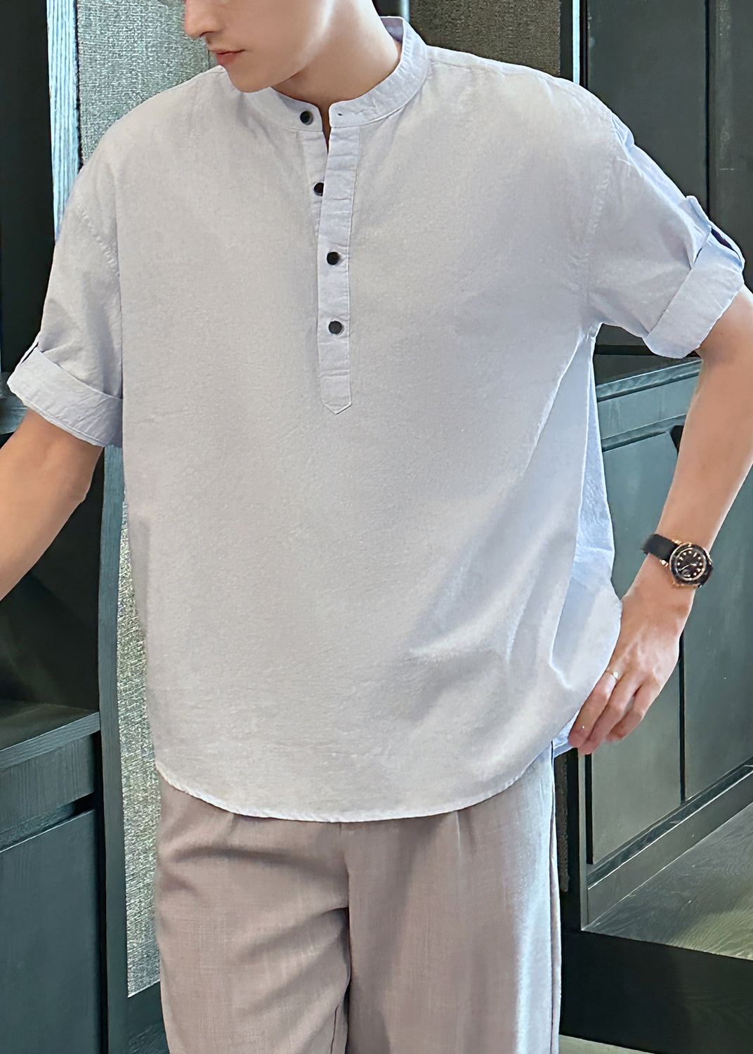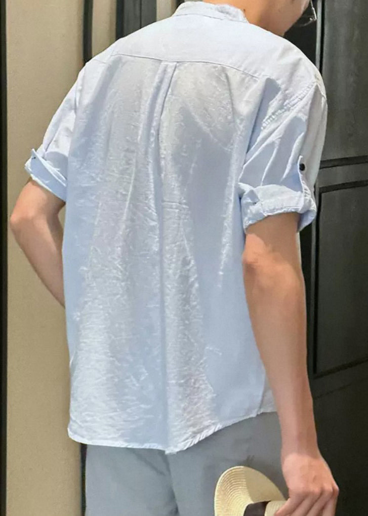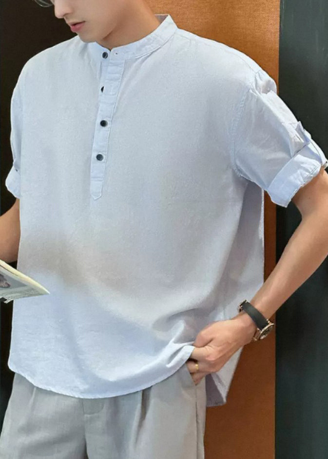 Loose Light Blue Stand Collar Button Cotton Mens Shirts Summe