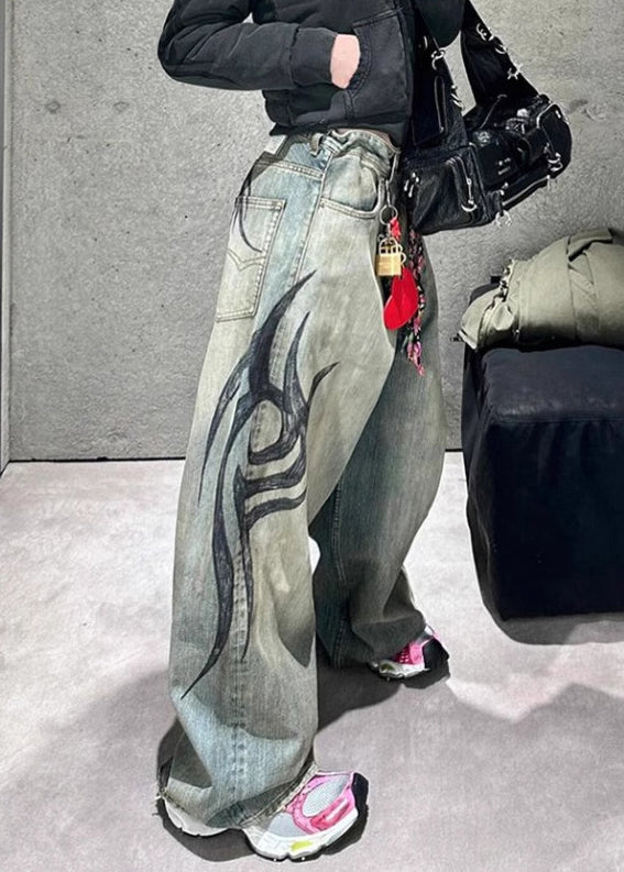 Modern Print Pockets High Waist Denim Wide Leg Pants Spring