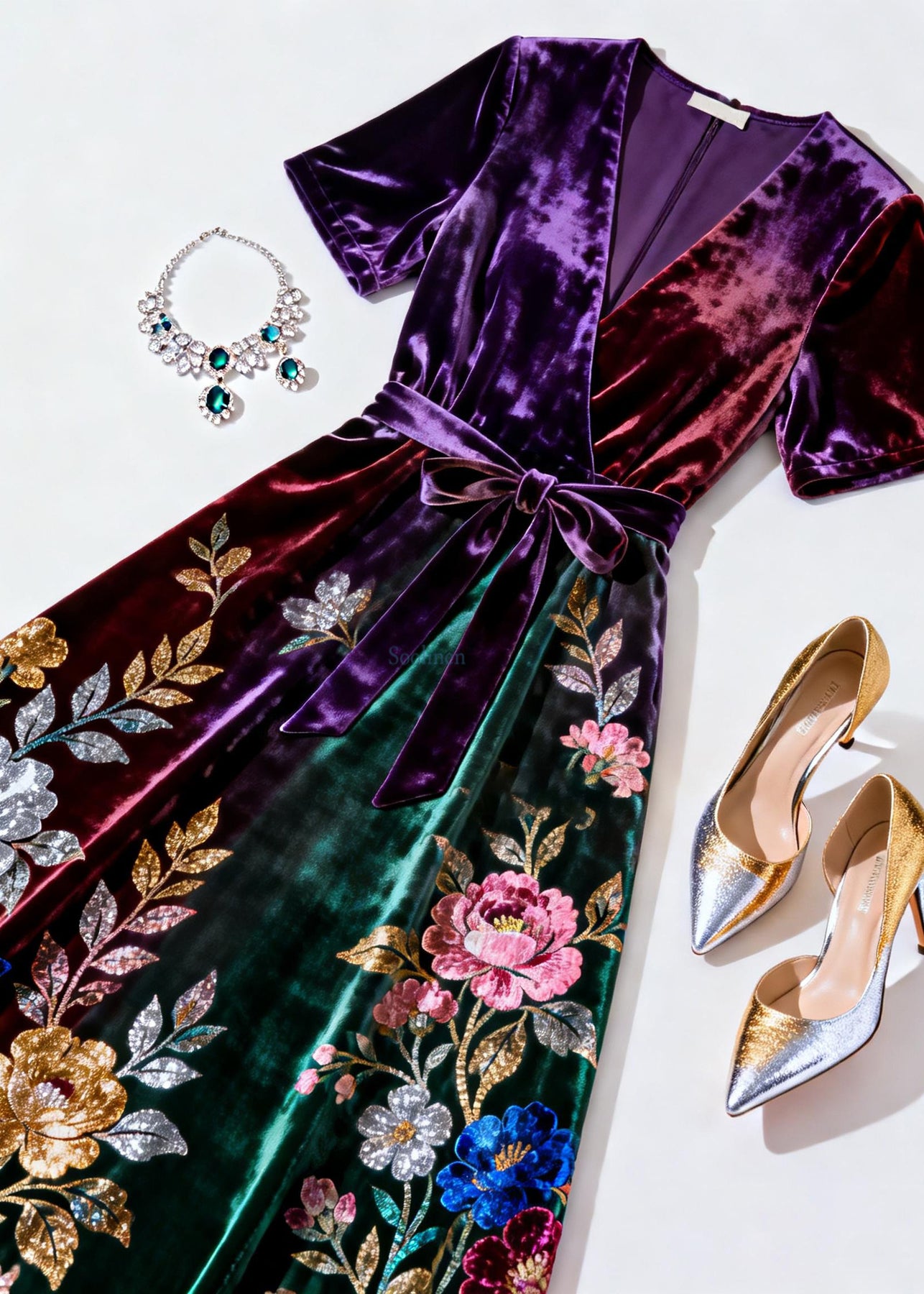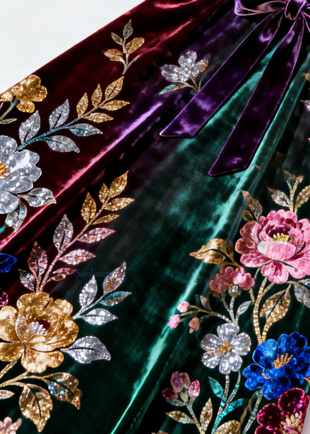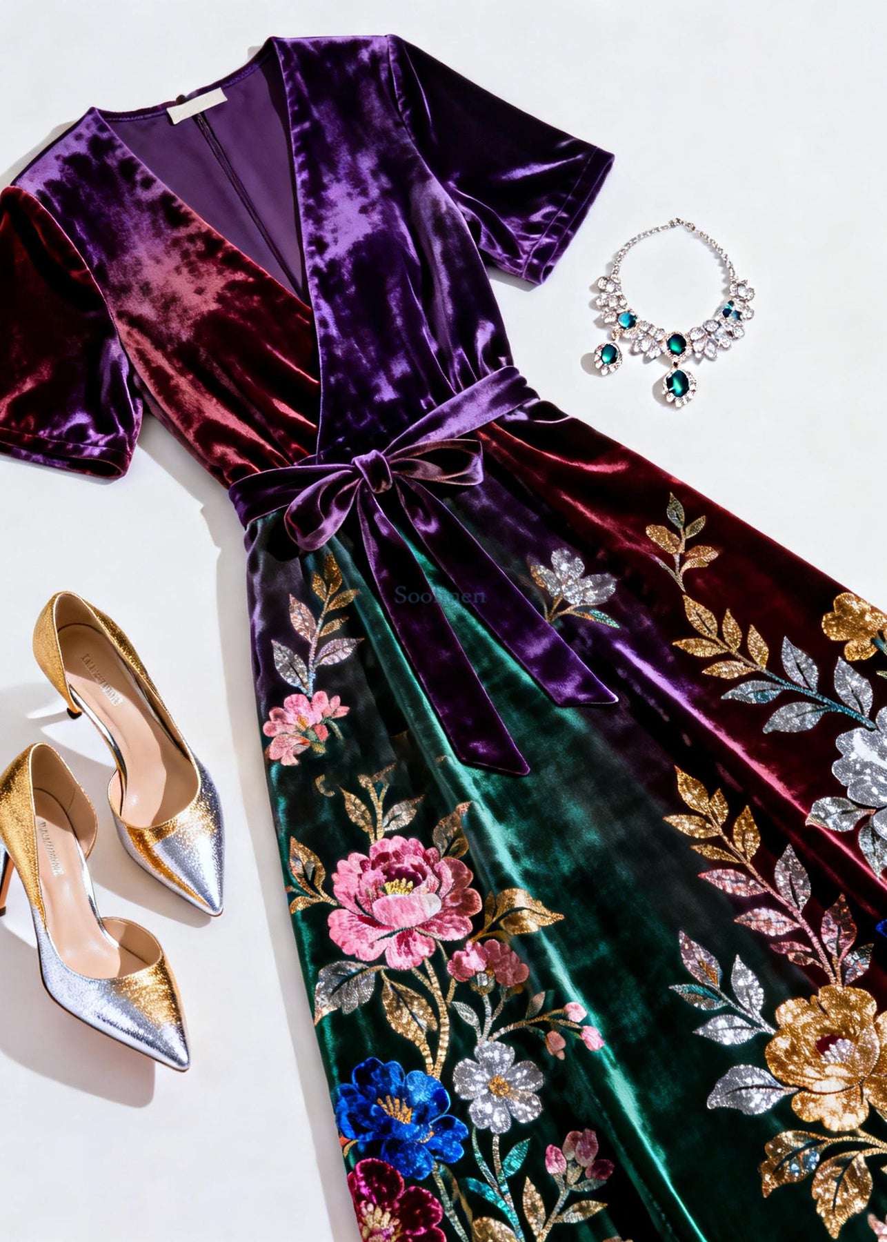 Gradient Color Print Tie Waist Silk Velvet Dresses V Neck Summer