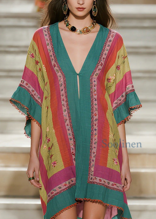 Loose Colorblock V Neck Print Cotton Mid Dress Summer