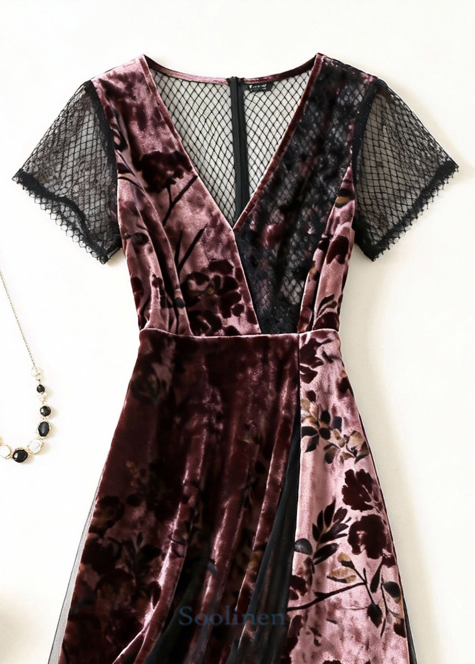 Pink Print Tulle Patchwork Silk Velvet Dress V Neck Summer