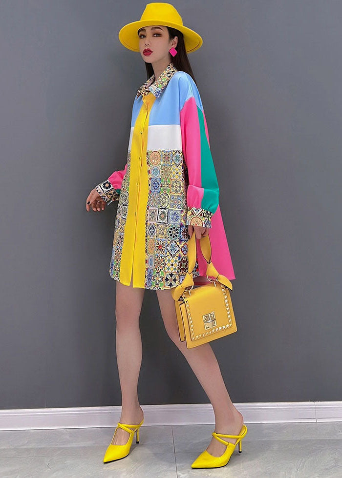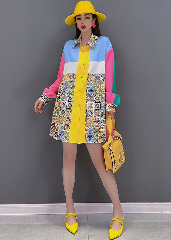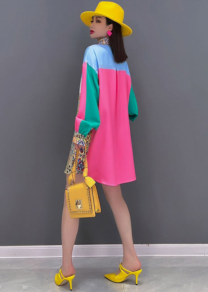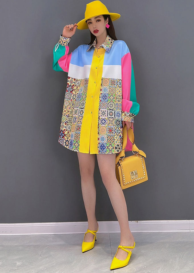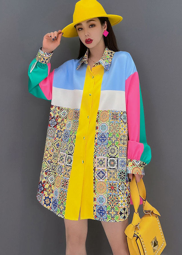 Bohemian Colorblock Peter Pan Collar Print Silk Shirt Top Long Sleeve