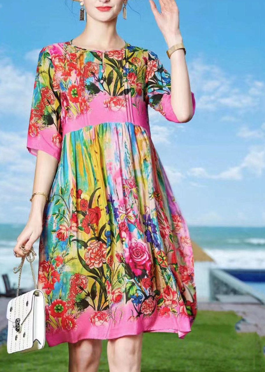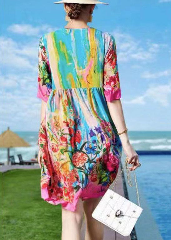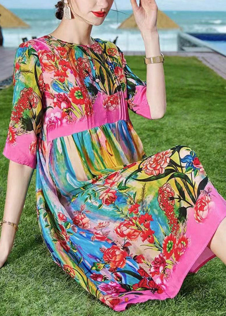 Bohemian Rose O-Neck Print Patchwork Silk Beach Dresses Short Sleeve