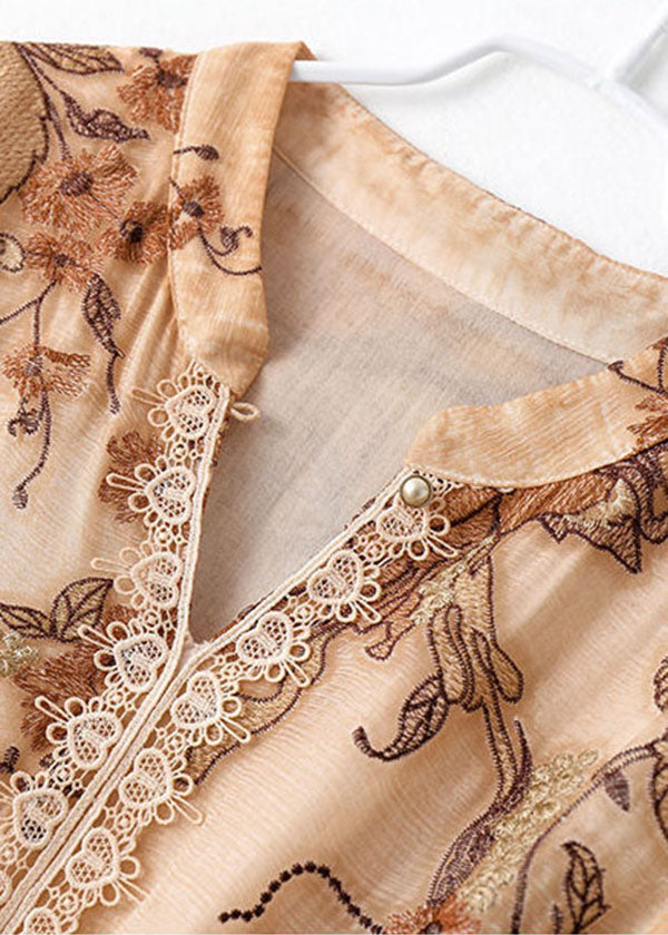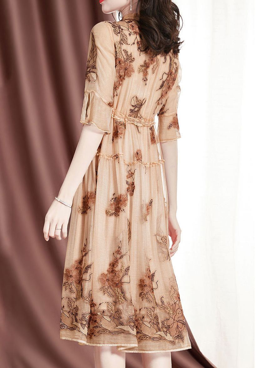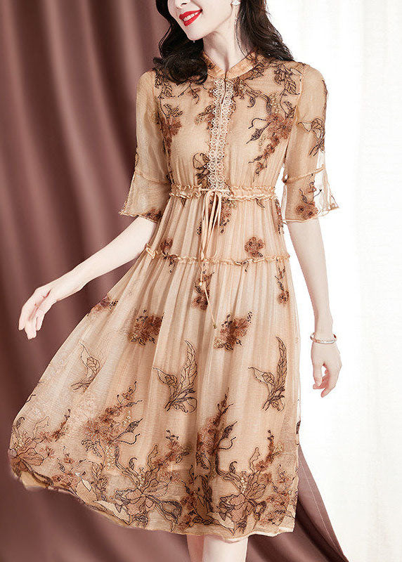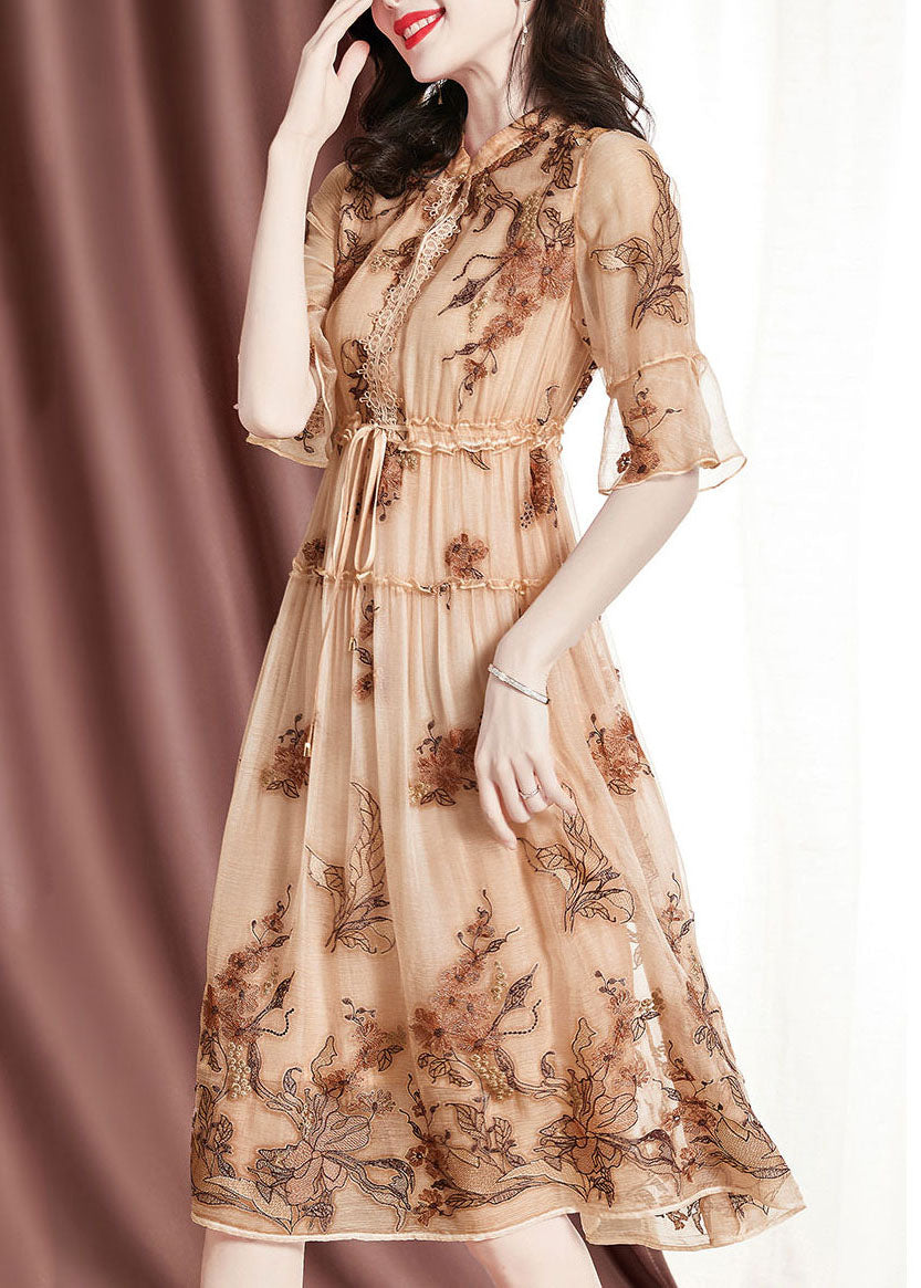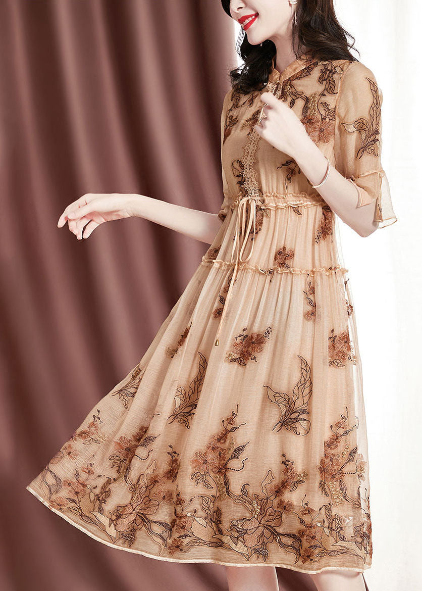Italian Apricot Stand Collar Ruffled Tie Waist Silk Cinch Dress Short Sleeve
