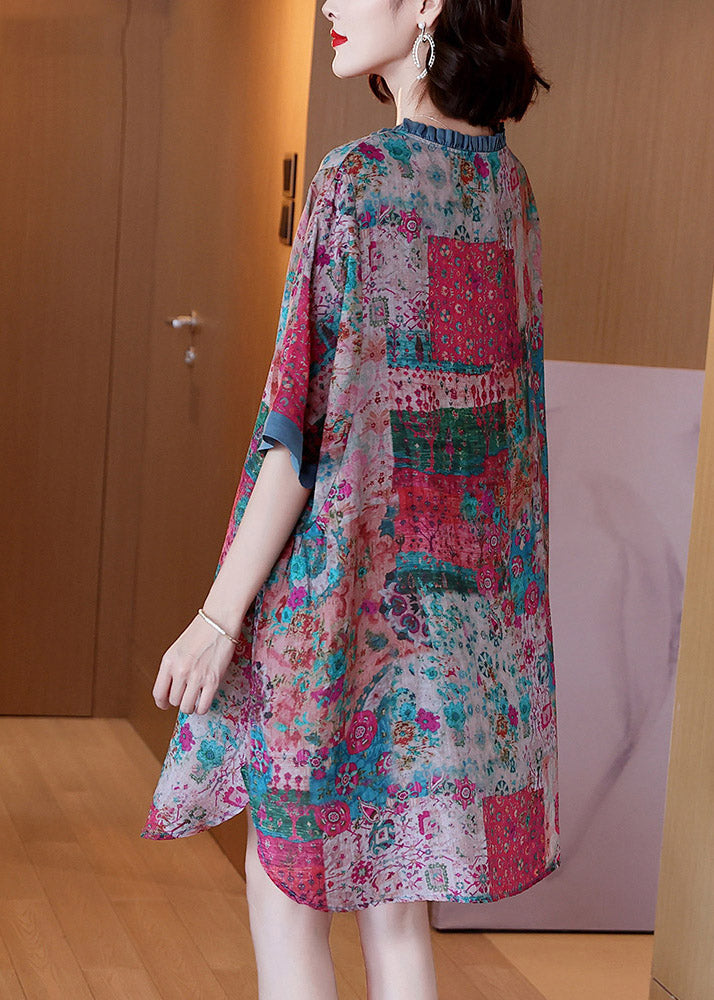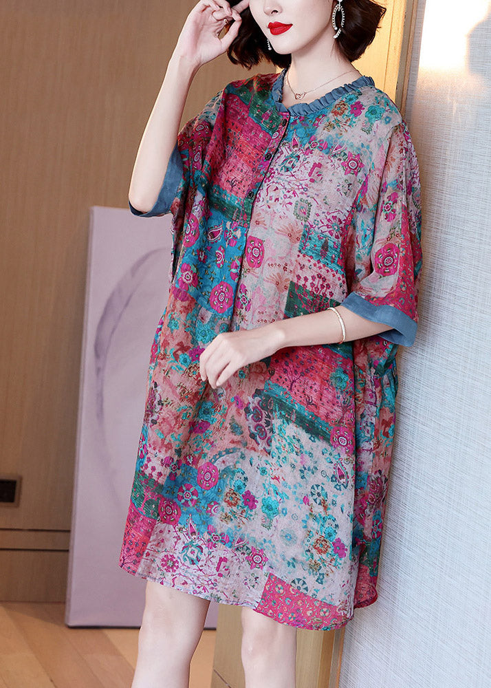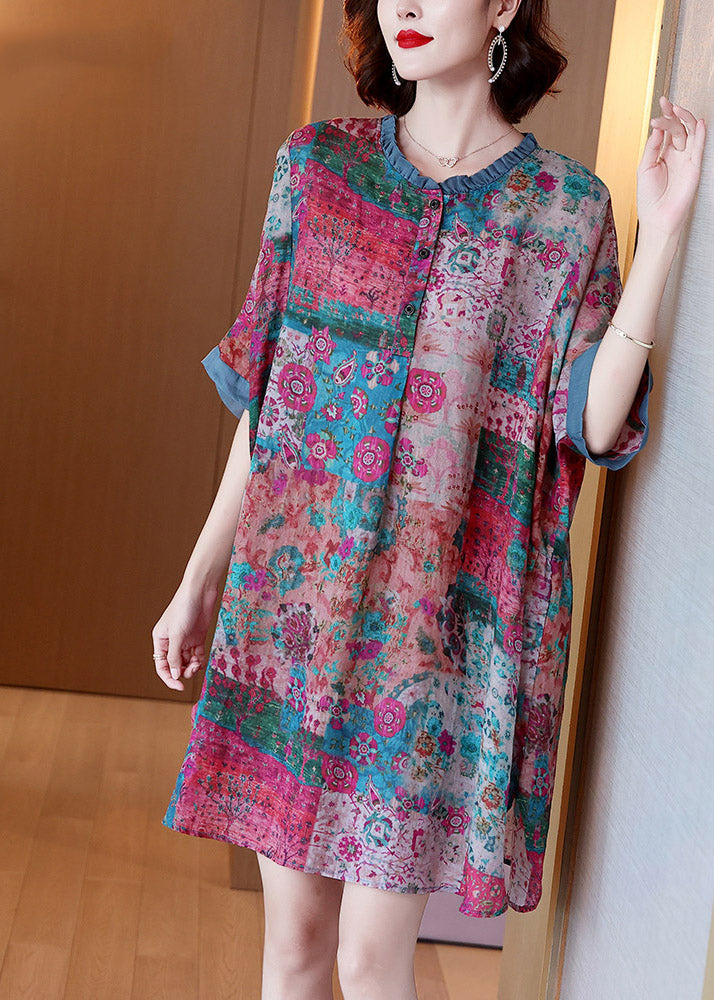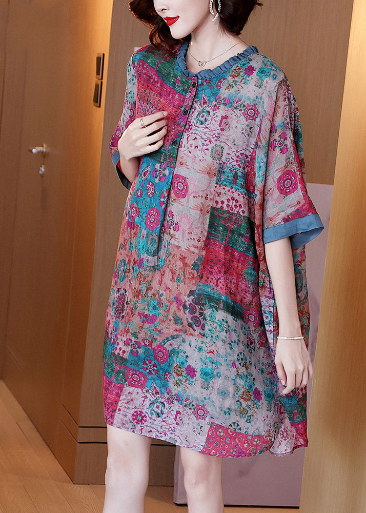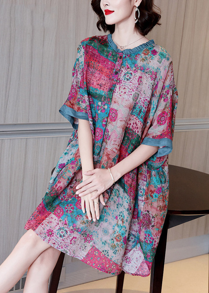 Plus Size Red O-Neck Print Button Side Open Linen Dress Half Sleeve