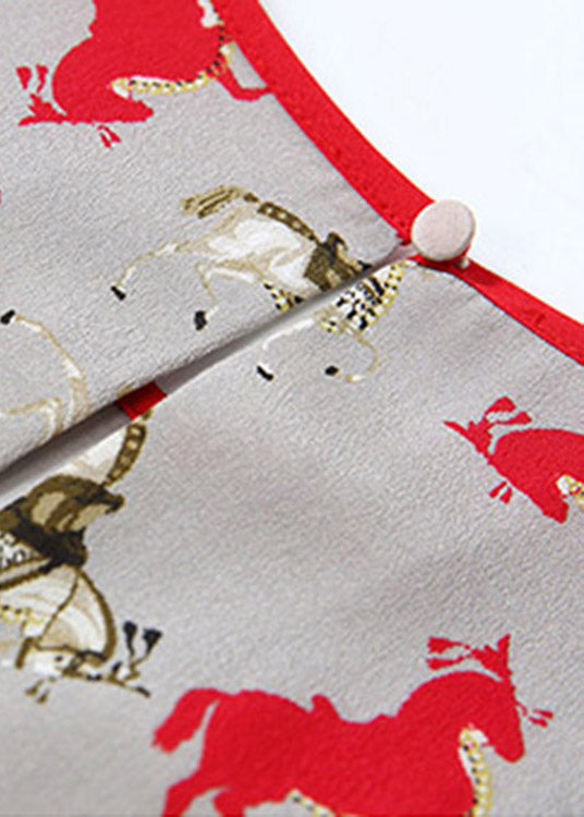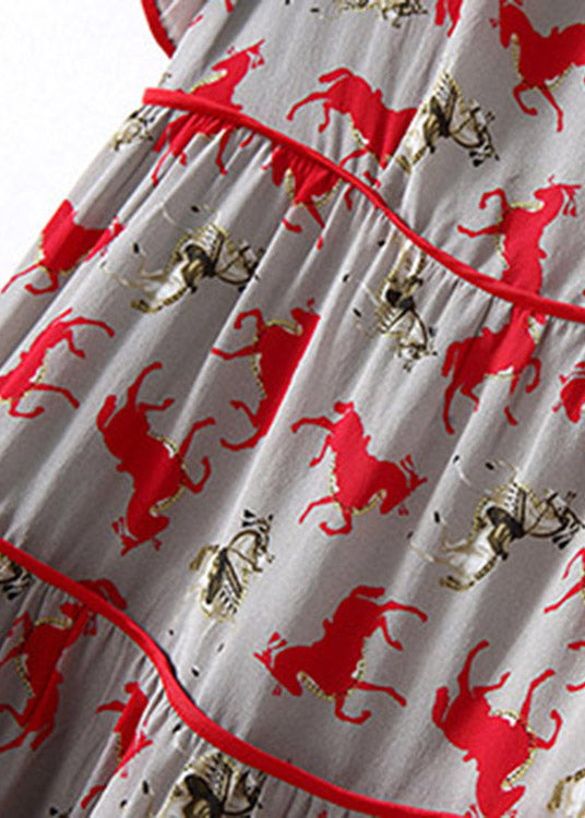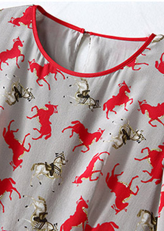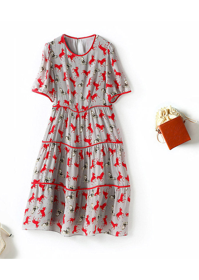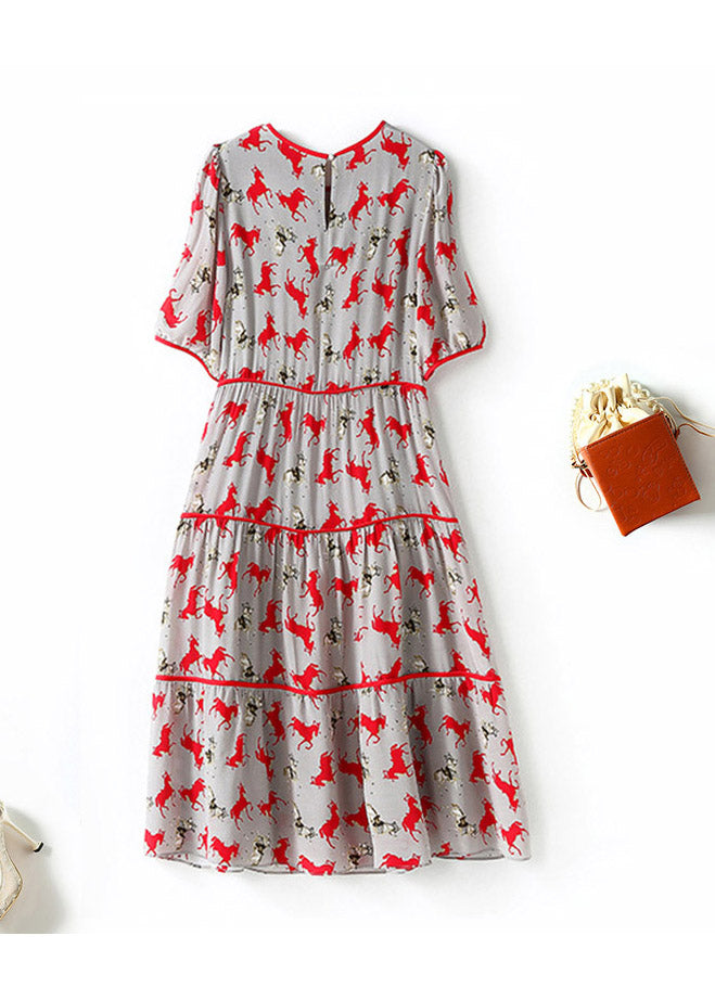 Retro O-Neck Print Patchwork Wrinkled Silk Mid Dress Short Sleeve