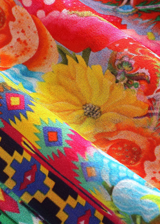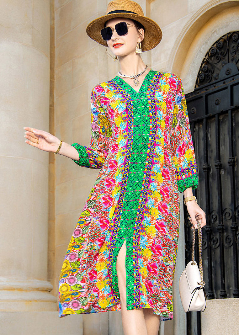 Sexy V Neck Print Pockets Silk Dress Long Sleeve
