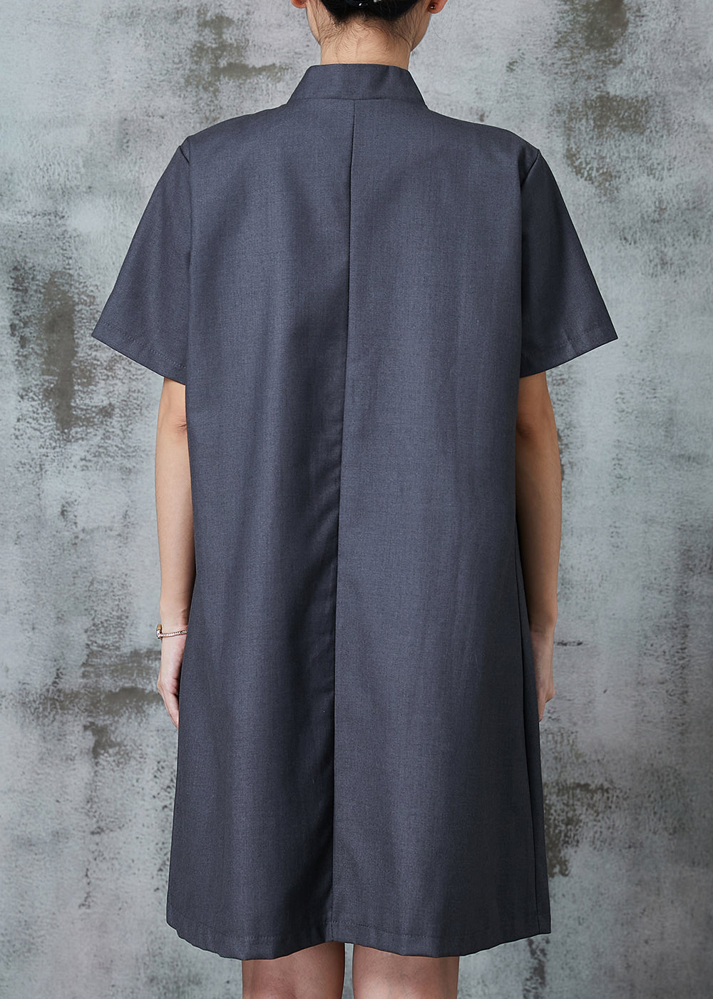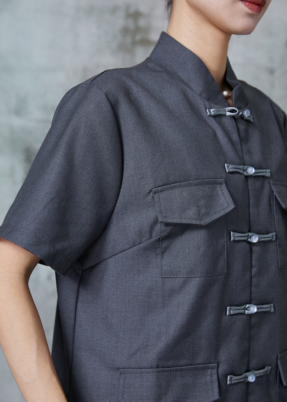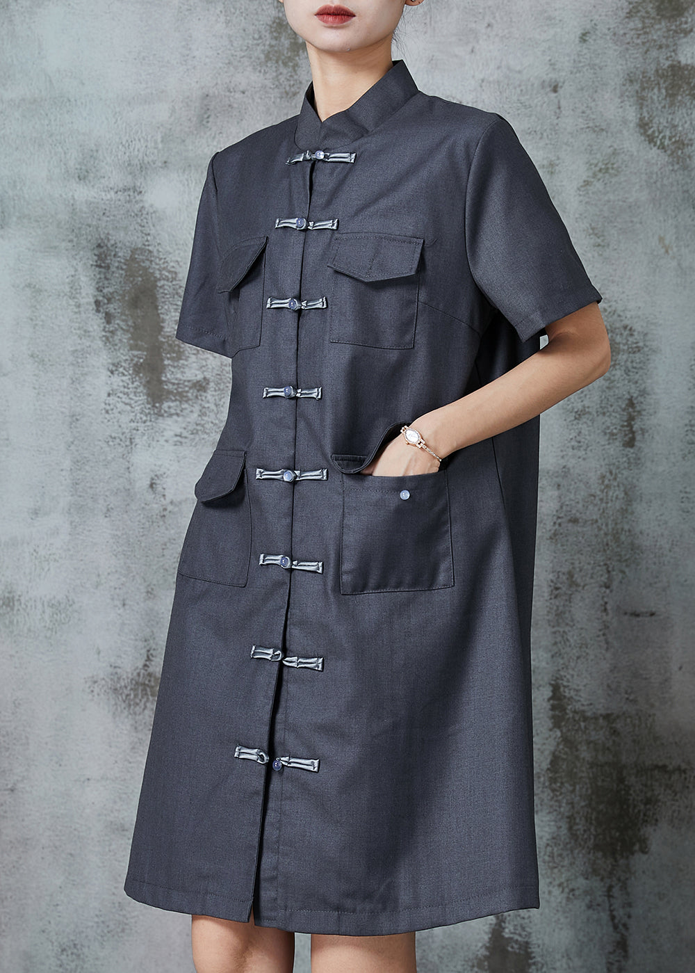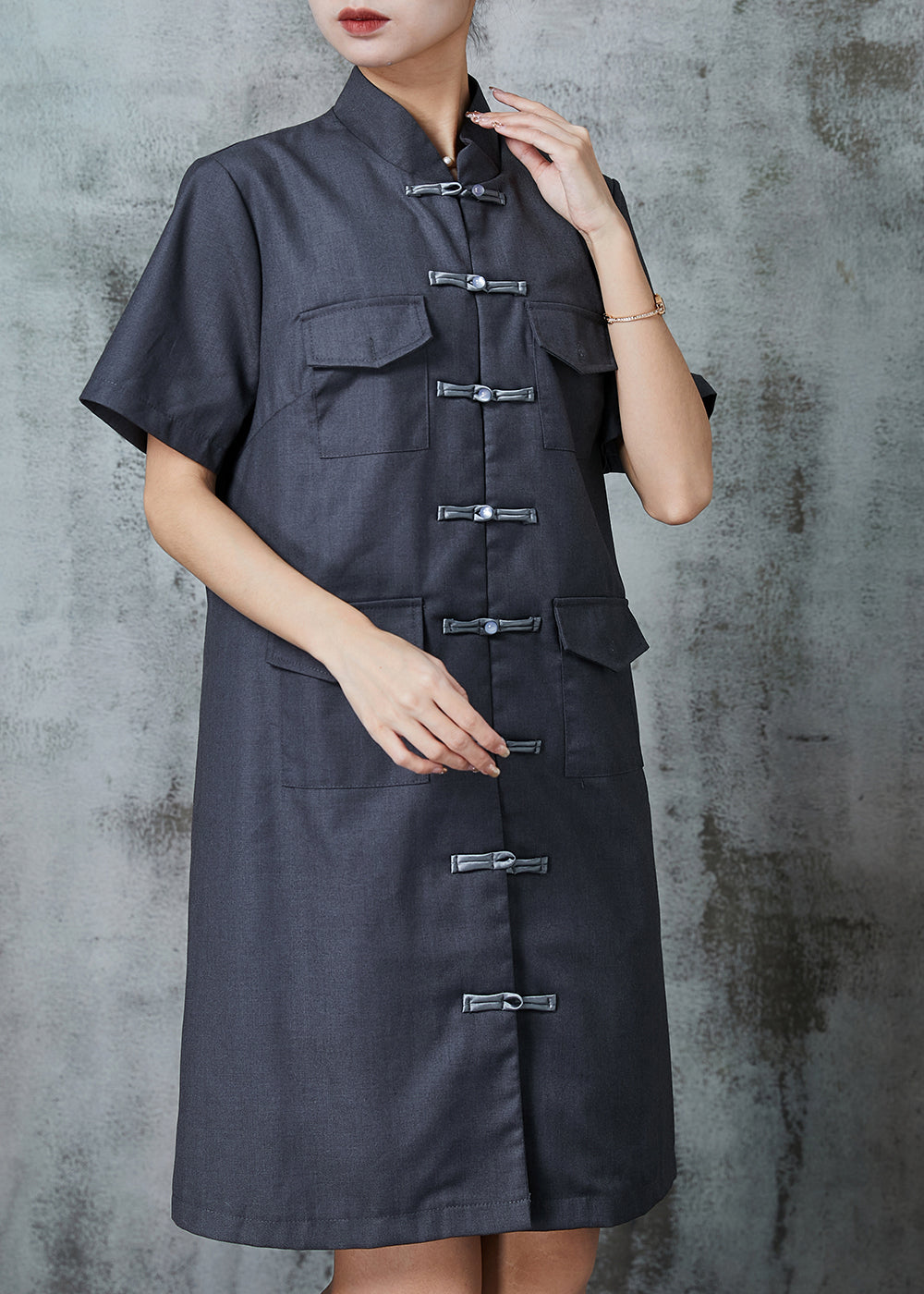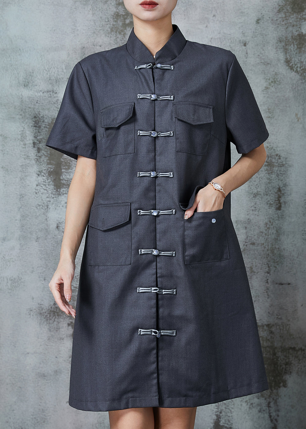 Vintage Grey Chinese Button Pockets Linen Dress Summer