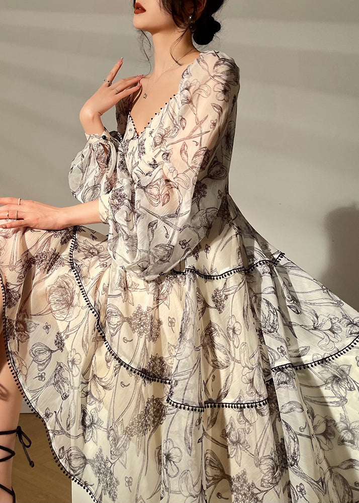 Vintage V Neck Print Chiffon Mid Dress Lantern Sleeve