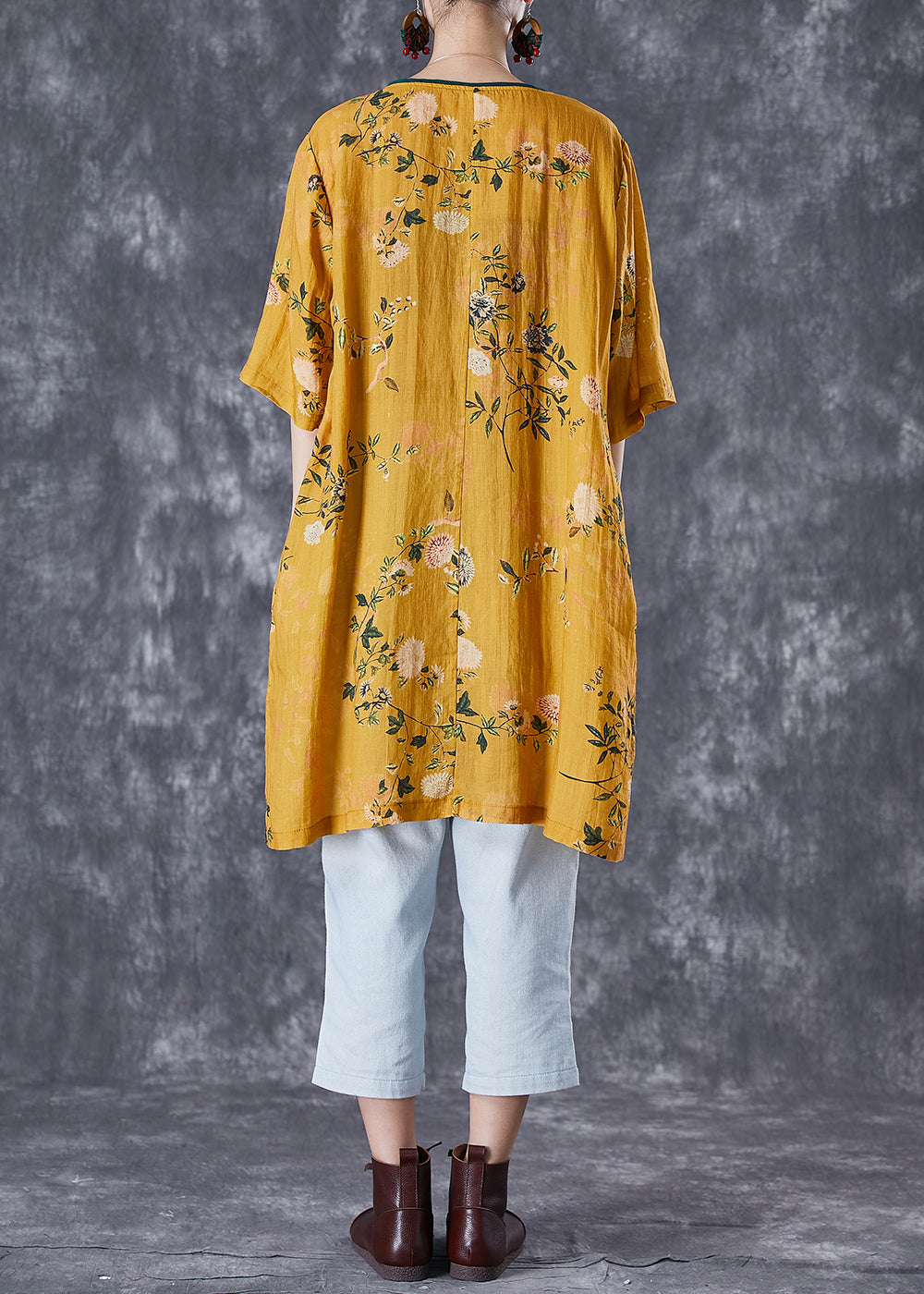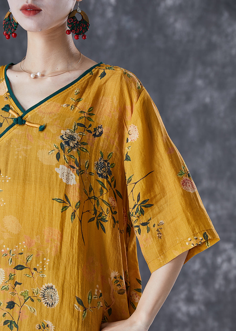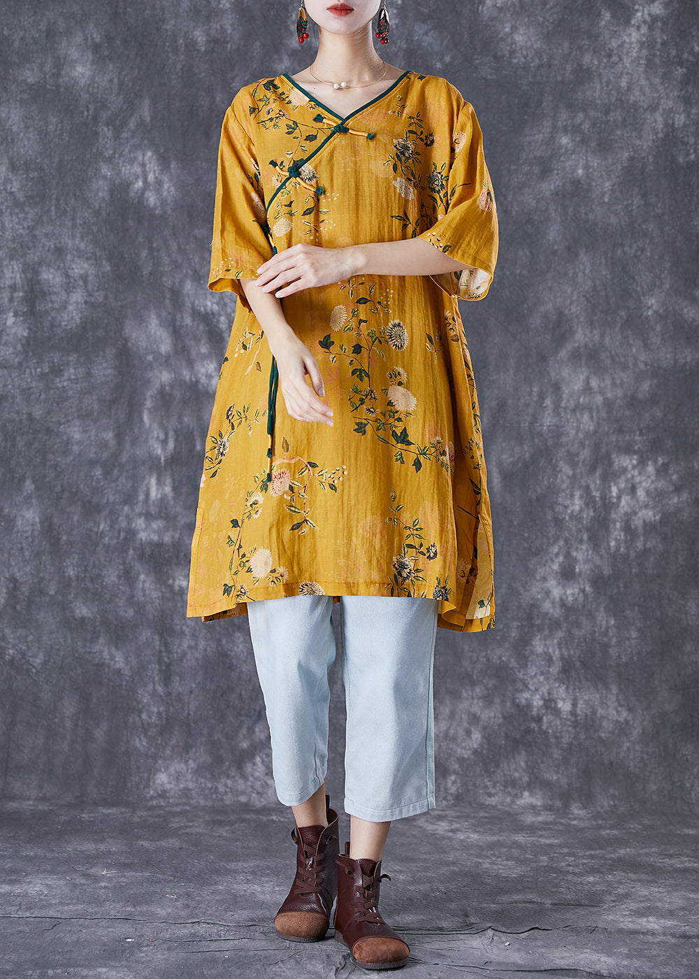 Vintage Yellow Tasseled Print Linen Dresses Summer
