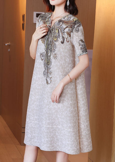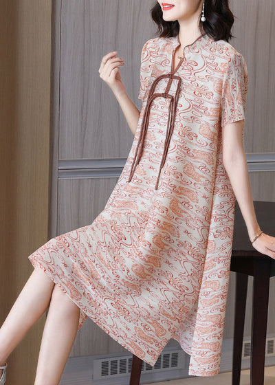 Vintage Khaki Print Tassel Side Open Silk A Line Dress Short Sleeve