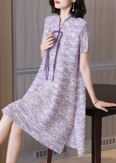 Purple Print Elegant Silk Mid Dress Stand Collar Draping Short Sleeve