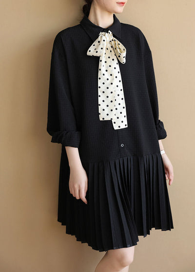 Casual Black Peter Pan Collar Patchwork Plaid Bow Necktie Cotton Pleated Dress Long Sleeve