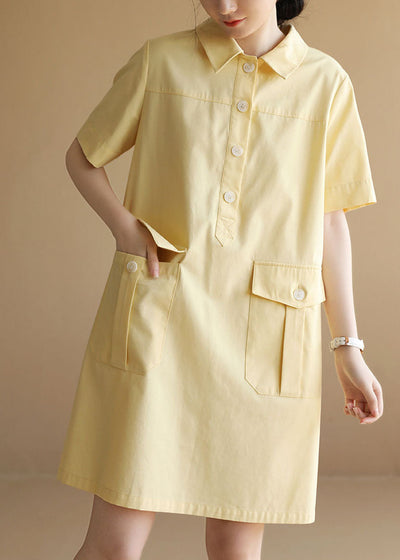 Classy Solid Yellow Peter Pan Collar Pockets Button Cotton Maxi Dress Short Sleeve