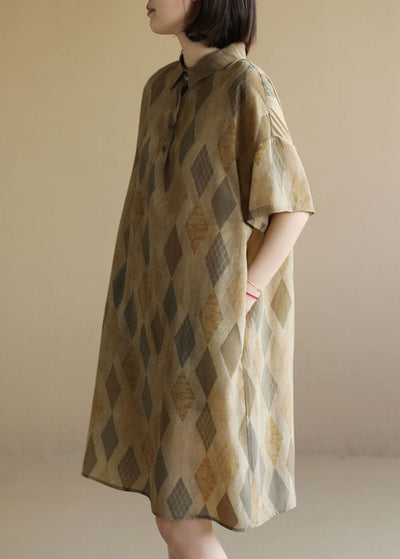 Diy Khaki Peter Pan Collar Print Top Quality Mid Dress Short Sleeve
