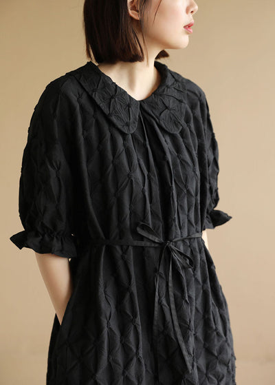 Baggy Chic Black Peter Pan Collar Wrinkled Lace Up Maxi Dresses Short Sleeve