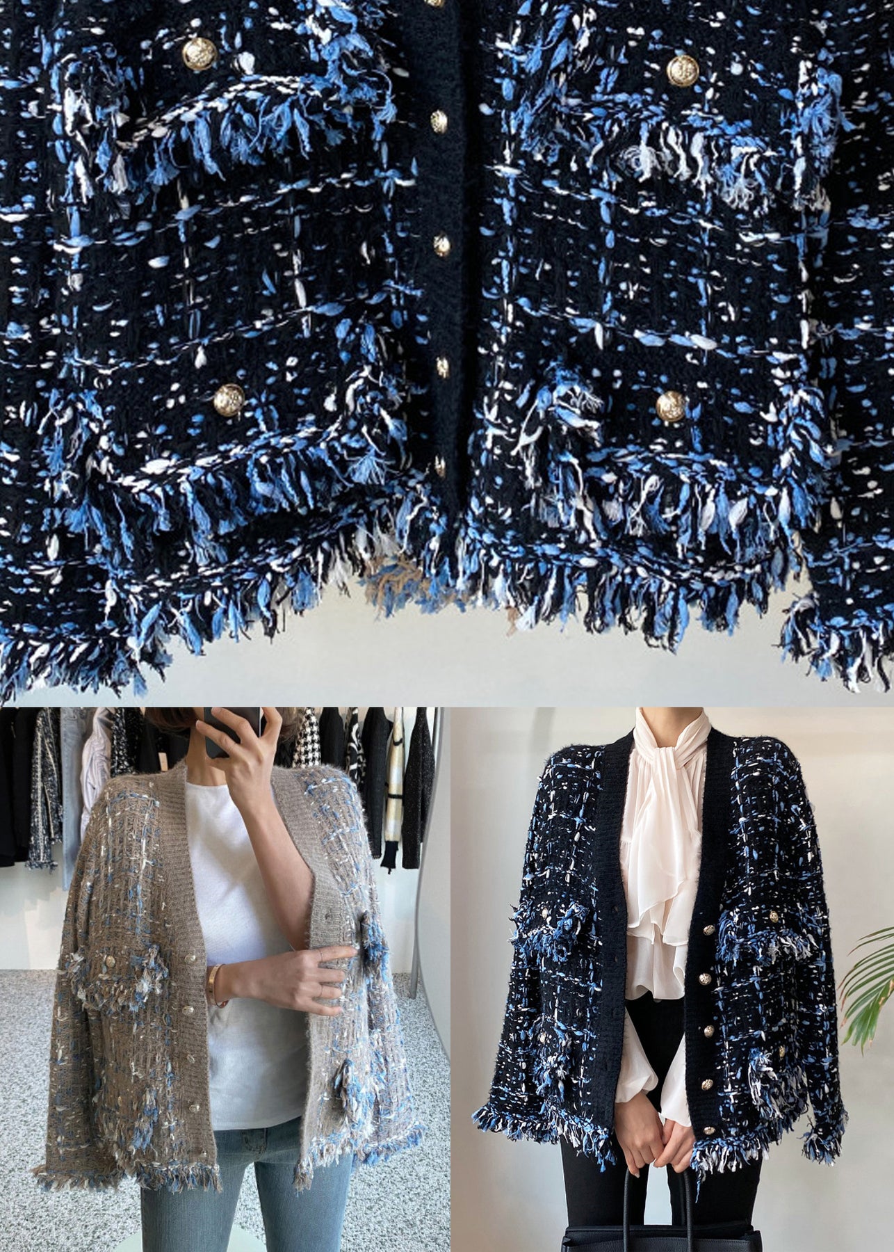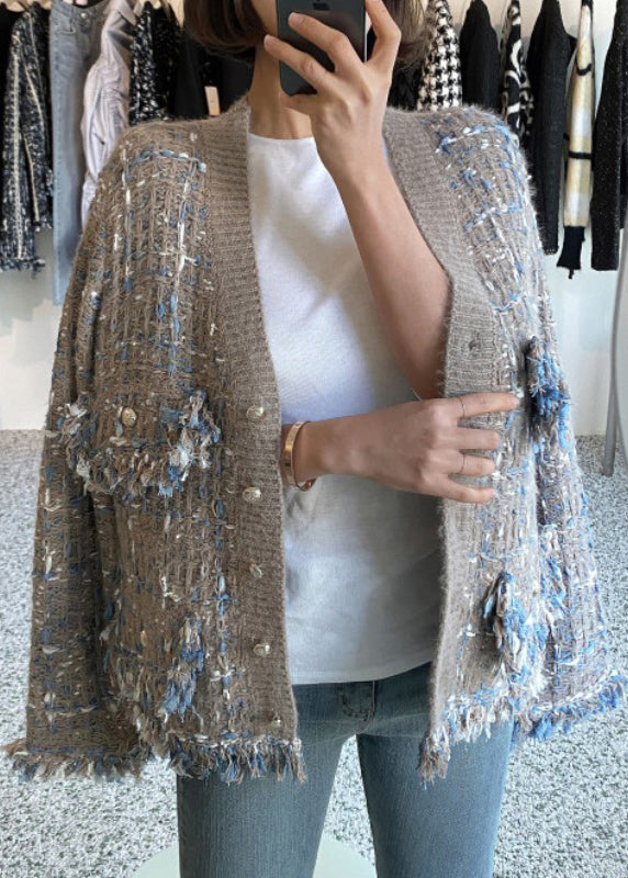 Khaki Tasseled Pockets Knitted Cotton Coat V Neck
