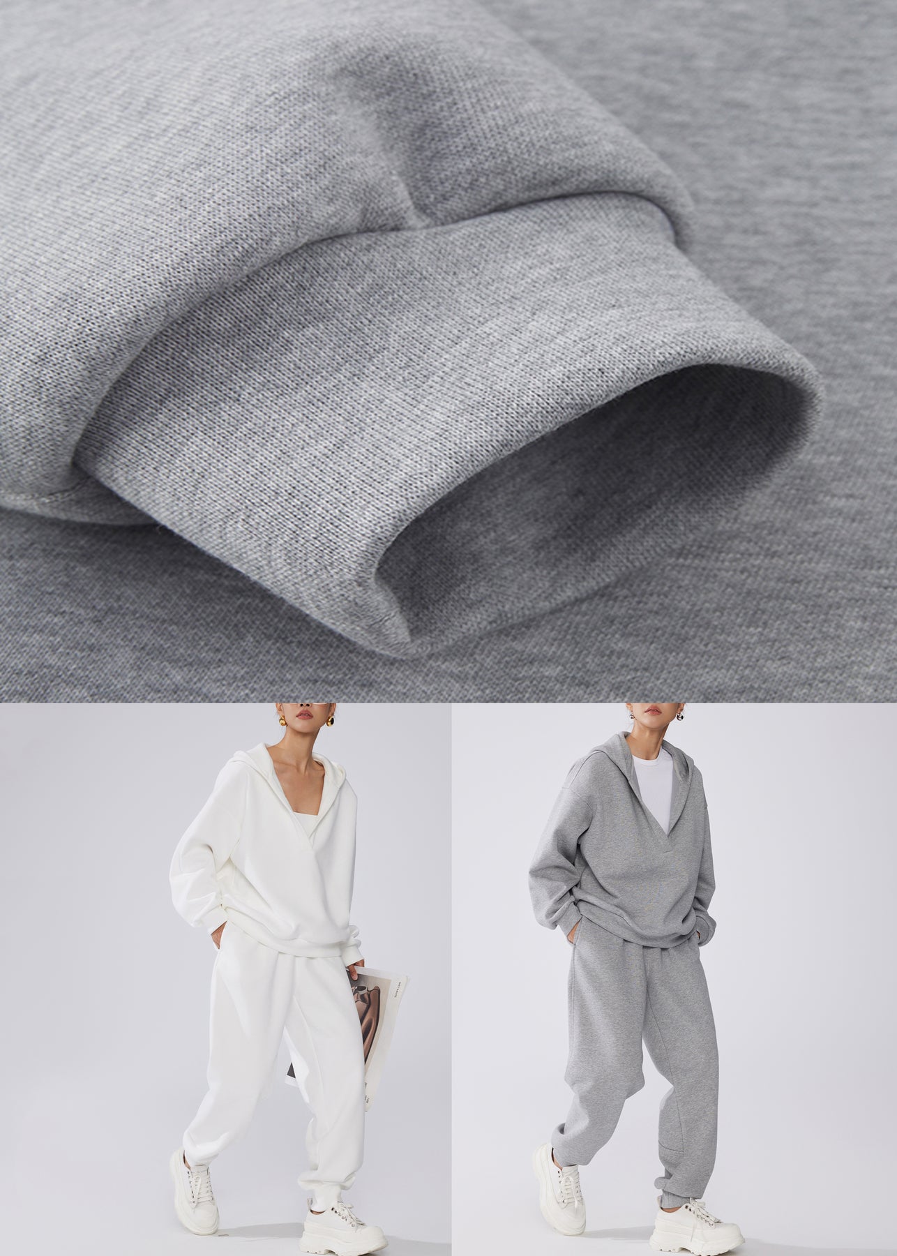 White Pockets Elastic Waist Warm Fleece Winter Two Pieces Set Hooded