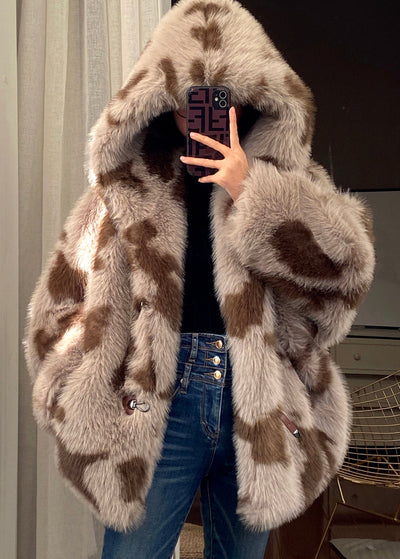 Chic Grey Stand Collar Print Patchwork Mink Velvet Coats Spring