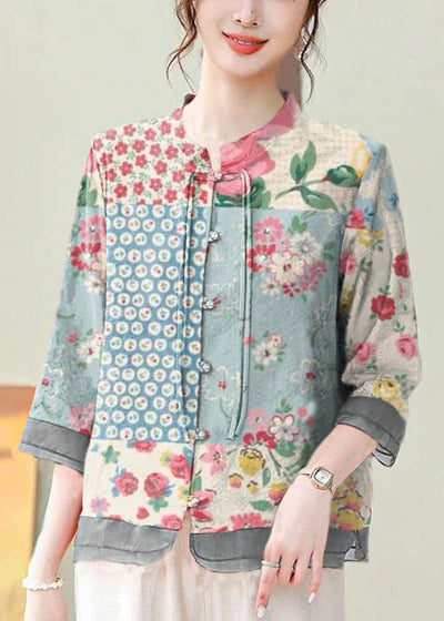Loose Blue Flowers Button Print Cotton Shirt Bracelet Sleeve