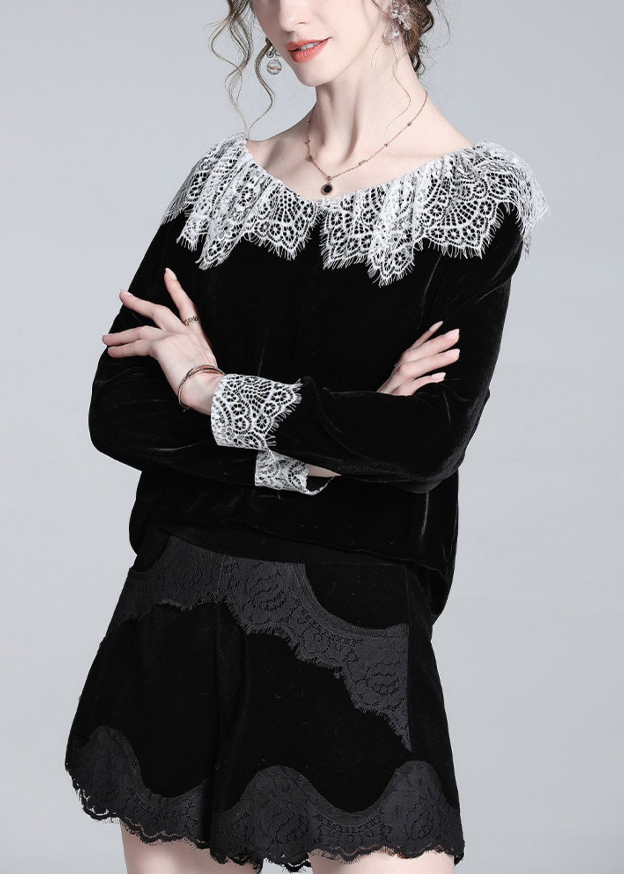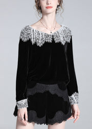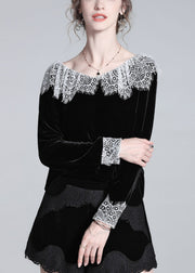 Beautiful Black Lace Patchwork Silk Velour T Shirt Winter