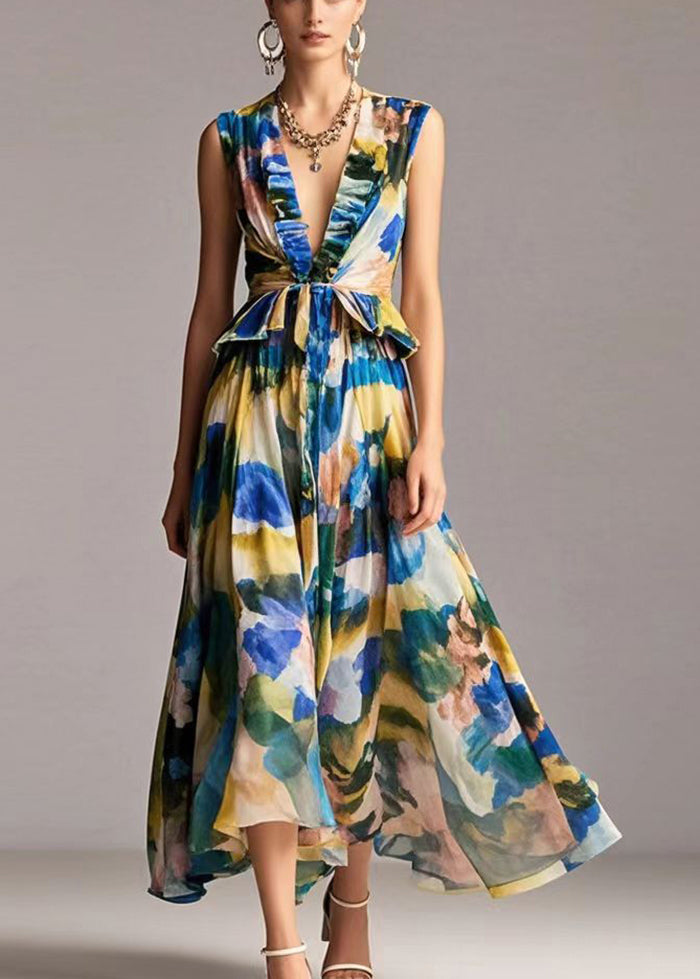 Italian V Neck Tie Waist Print Chiffon Dress Sleeveless