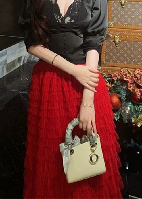 Loose Red Wrinkled Elastic Waist Tulle Skirts Summer