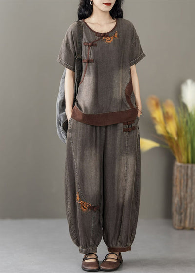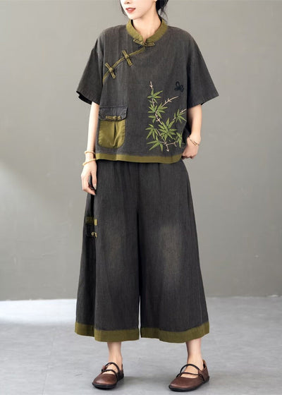 Women Grey Embroidered Elastic Waist Cotton Crop Pants Summer