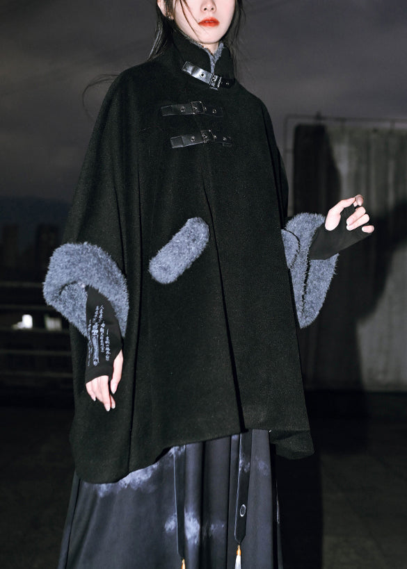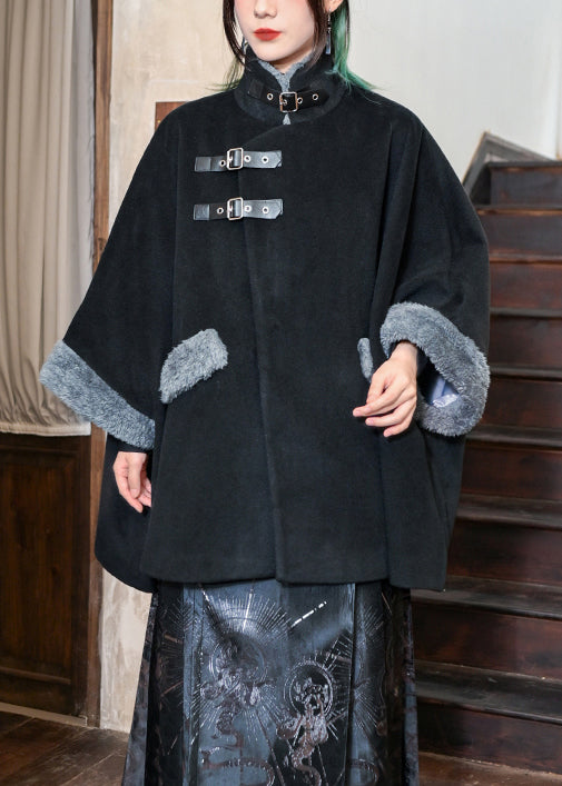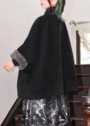 Loose Black Pockets Patchwork Warm Fleece Coats Batwing Sleeve