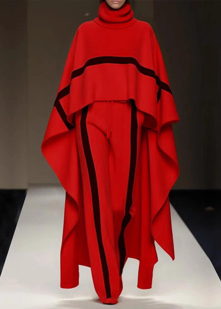 Stylish Beige Turtleneck Striped Top And Pants Two Pieces Set Batwing Sleeve