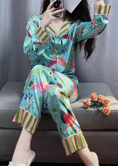 Fashion Blue Striped Print Button Ice Silk Pajamas Two Pieces Set Spring
