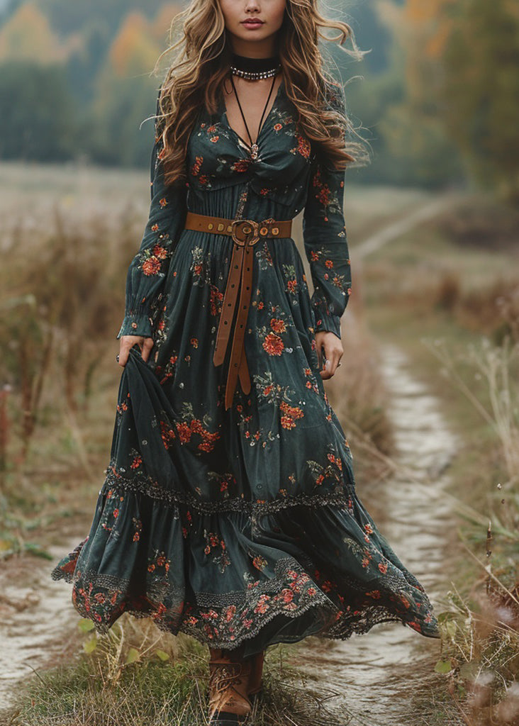 Boho Green V Neck Print Patchwork Cotton Maxi Dresses Spring