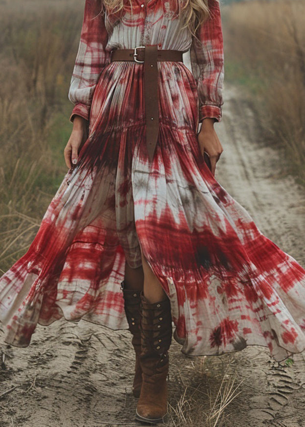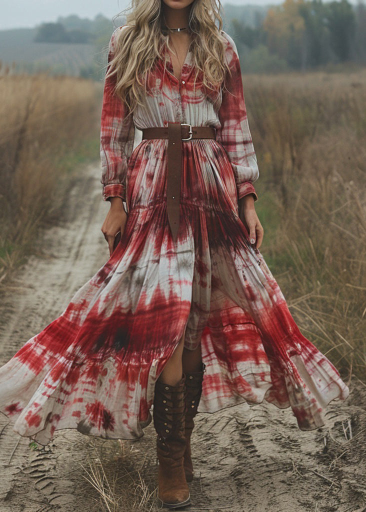 Women V Neck Tie Dye Cotton Pastoral Style Long Dress